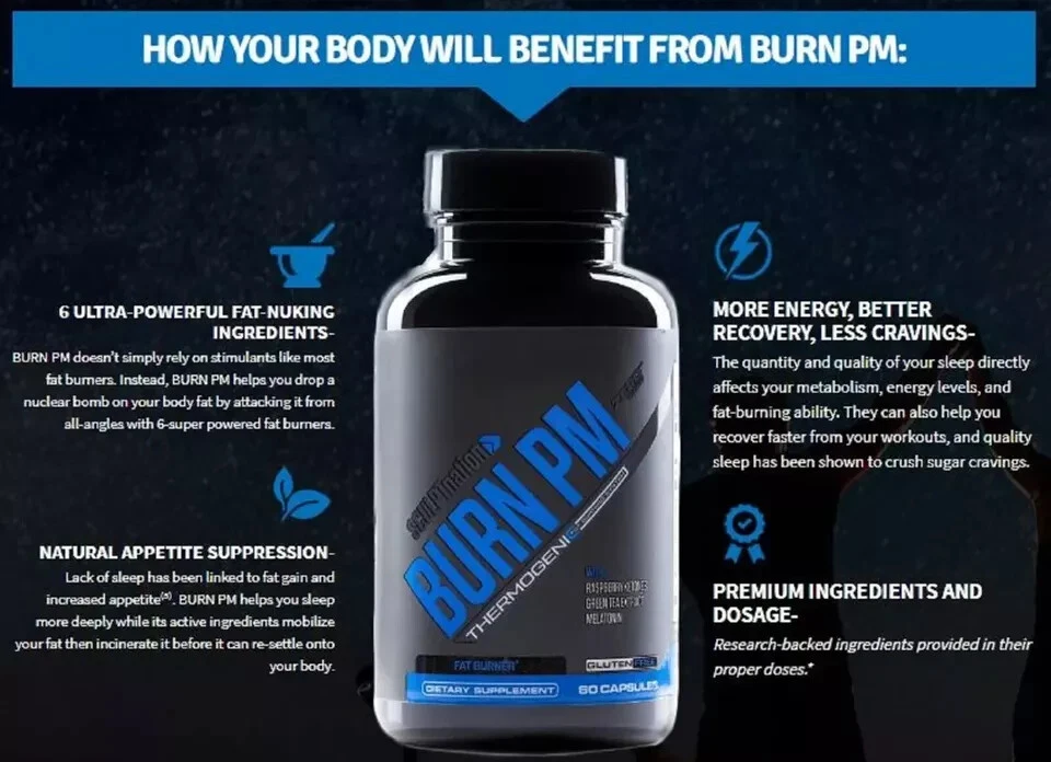 sculptnation product !!! Huge Sale !! 1 Pack " BURN PM " = 60 Capsules BURN PM is a nighttime thermogenic designed to help you burn fat specifically while you sleep. BURN PM’s thermogenic formula includes powerful natural sleep enhancers to help you enjoy deep, Cortisol-crushing sleep. BURN PM’ S ALL-STAR FAT-SHREDDING TEAM RASPBERRY KETONES Want to reach into your cells and literally pull the fat out before pulverizing it? Raspberry Ketones have been shown in animal studies to help your body eviscerate fat within your body’s cells (6) They also help you produce Adiponectin, a protein your body uses to regulate your metabolism and help prevent fat accumulation inside your fat cells (8, 9) . Combined with regular exercise, Raspberry Ketones will supercharge your fat loss. L-TRYPTOPHAN If you want to crush Cortisol, and be able to easily fall into a deep, muscle-building, fat-burning sleep, L-Tryptophan has been scientifically proven to be one of the most powerful natural sleep aids in the world (10) Your body cannot produce L-Tryptophan. That’s why it’s ultra important to get this powerful ingredient into your body through supplements. BURN PM uses a potent strain of L-Tryptophan to help you get better sleep and improve performance. WHITE KIDNEY BEANS Want to stop your body from converting starches to fat? Exercise helps burn off excess starches from the food you eat, but unfortunately, there will always be some left in your bloodstream. White Kidney Beans have been proven to help prevent your body from using those extra starches and blocks them from becoming body fat. (11) LEMON BALM LEAF Lemon Balm Leaf is a powerful natural sleep aid. (12) Remember, sleeping deeply every night helps curb cortisol levels, which helps your body get out of fat-storage mode while turning on your body’s fat-burning machinery. Lemon Balm Leaf is loaded with antioxidants and improves digestion, which can help your body torch fat faster. SAFFRON FLOWER Saffron Flower is loaded with special antioxidants, including crocetin and crocins, that hunt down and destroy fat in your bloodstream. Saffron Flower’s antioxidant blend is so powerful that studies have shown it can help reduce waist size and manage weight. (13) GREEN COFFEE BEAN EXTRACT If you want to shred fat fast, you need to torch fat in your cells while you sleep. Boost fatty acid oxidation (14) Increase lipolysis inside fat cells (15) Elevate levels of plasma adiponectin (14) Why not just drink coffee? Unfortunately Chlorogenic Acid is destroyed when coffee is roasted. Luckily, we’ve isolated this powerful fat loss agent and loaded a maximum dose into BURN PM. DANDELION ROOT Sick of feeling bloated after you eat? Do your protein shakes make you feel like you swallowed a balloon? Dandelion Root has been used for hundreds of years as a digestive aid. It has been shown to reduce bloating, and can increase your body’s Vitamin A levels. Because BURN PM contains a max dose of Dandelion Root, you’ll actually wake up feeling more ripped every single day. MELATONIN Melatonin is a powerful natural sleep aid. However, helping you quickly fall into a deep, restorative sleep is only a small part of how Melatonin can help accelerate your fat burning. Studies show that Melatonin can actually help you burn body fat by increasing a special type of fat in your body. Seems contradictory, but Melatonin may increase “Beige” fat. (16) Beige fat increases your body’s thermic-sensitivity to exercise. Quite simply, this fat helps your body shred more fat every time you workout. (17) Every dose of BURN PM gives your body the Melatonin it needs to help you fall asleep, and increase beneficial Beige Fat. VITAMIN D3 CHOLECALCIFEROL Want to increase your leptin levels, suppress your appetite, and supercharge your metabolism around the clock? Studies from around the world have shown that Vitamin D plays a major role in how much Leptin your body produces. (17) Vitamin D deficiencies have been linked to increase fat gain and obesity. (18) It also helps blunt your appetite by telling your brain that you feel full. One study in Australia actually showed that people who ate a breakfast high in Vitamin D reduced their appetites dramatically for the next 24-hours! BURN PM contains a healthy megadose of Vitamin D3 Cholecalciferol, your body’s preferred form of Vitamin D, the same type that your skin cells synthesize from sunlight to help your body produce more Leptin, and burn more fat.
