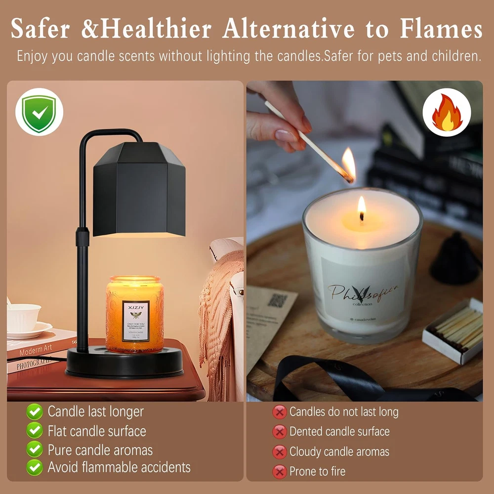 【Make Your Candles Last Longer】✨:XJZJY candle warmer lamp uses heat energy to melt candles and wax from top to bottom instead of lighting it,It will lasts twice as long as burning,It’ll save you money on candles, or, save you money to buy more candles. 【Candle Warmer Lamp With Timer】🏠:If you always worried about starting a fire When you forgot to blow out a candle,This candle warmer takes away the worry. XJZJY candle warmer is Flameless and Smokeless which will greatly reduces the risks of fire concerns and keep you away from any hazardous substances. 【Fit Most Candles】🕯️:XJZJY candle warmer have a Large base,Which Can hold candles up to 5" wide and 6.3" tall, Enjoy the fragrance of your favorite scented jar candles such as the Yankee candles, Bath and Body Work 3 Wick Candles and more! Our candle warmer are engineered to last long so you can safely enjoy it for years 【Long Lasting Fragrance】🤩:This Candle warmer lamp uses heat energy to melt candles instead of burning it,It can evenly melts candle wax,The fragrance can last up to twice as long compared to burning it. 【Best Gifts】🎁: XJZJY Candle warmer lamp will be the best gift choice to show your love to your families, lover, or friends .Elegant appearance and practical performance make this candle warmer birthday gifts for women, mothers day gifts for mom. Ideal for Mother's Day, Valentine's Day, Thanksgiving, Christmas gifts or other special occasions. Product Description The video showcases the product in use. The video guides you through product setup. The video compares multiple products. The video shows the product being unpacked.