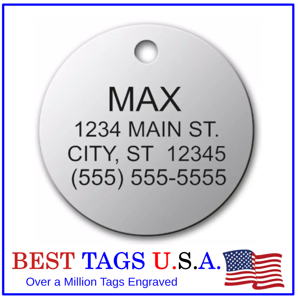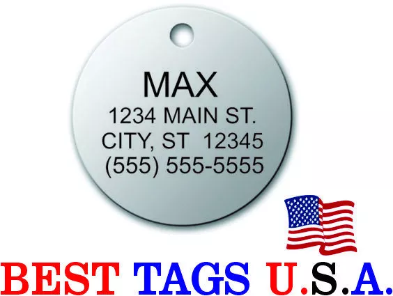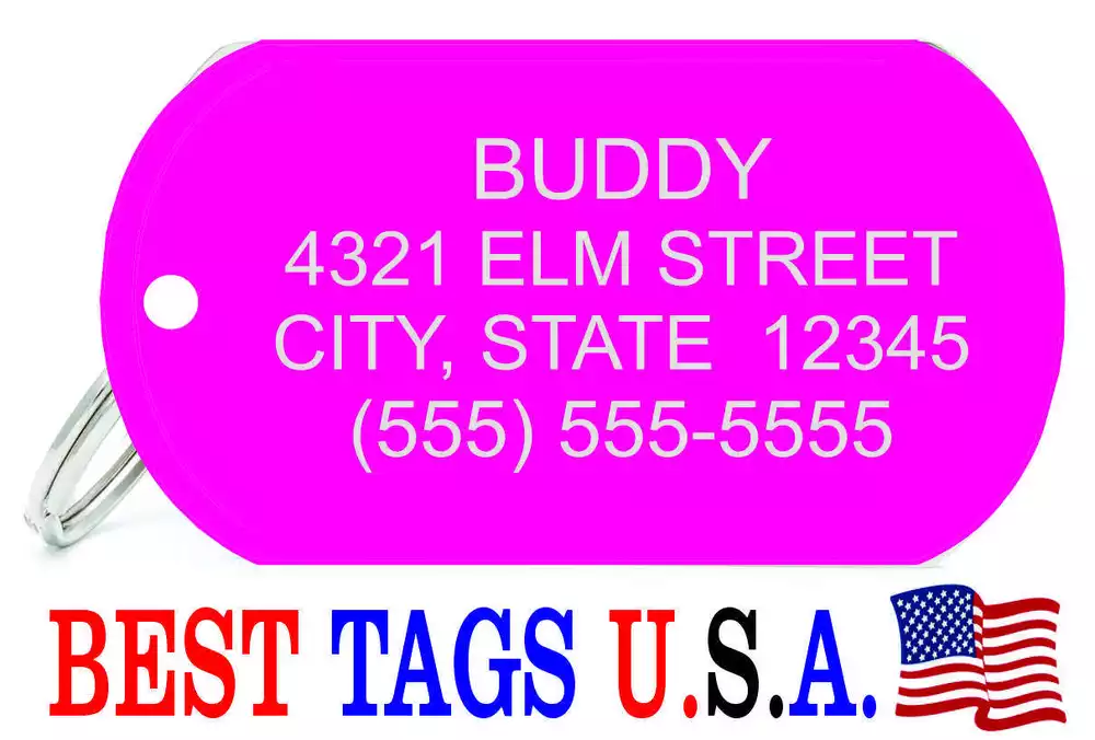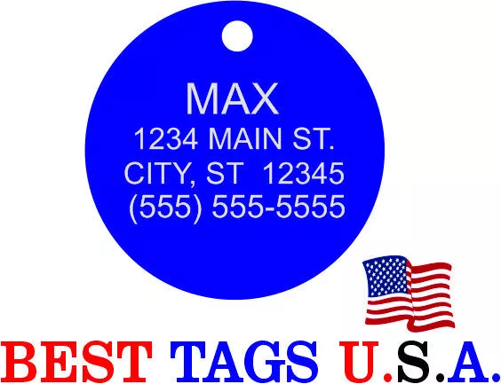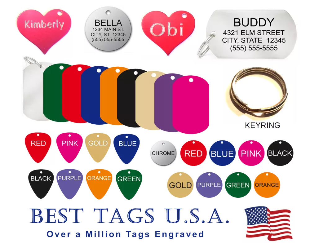 BEST TAGS PERSONALIZED- ENGRAVED WITH REFLECTIVE SAFETY TEXT M A D E I N U. S. A. >>>WE SHIP USPS WITH TRACKING<<< NOTE: Tags are engraved and shipped Friday of each week. Handling time will vary from 1 to 7 days, depending on what day you order. YOUR CHOICE OF: MILITARY DOG TAG (2" x 1.1") 1" Diameter Small CIRCLE 1.5" Diameter Large CIRCLE GUITAR PICK (Standard guitar pick size) 1" HEART ALL TAGS INCLUDE A KEY RING UP TO 5-Lines of Text Engraved per side on Military & 1.5" Circles, 4-Lines on Guitar picks & 1" Circles, 3-Lines on Hearts 2-SIDED TAGS available in drop-down menu if you want engraving on both sides. DEEP DIAMOND ENGRAVED - THE BEST! -LONG LASTING- WON'T RUB OFF LIKE CHEAP LASER ENGRAVING OR INK STAMP =YOU CAN "FEEL" OUR ENGRAVING= TAGS ARE MADE OF LIGHT-WEIGHT DURABLE Anodized Aluminum HOW TO ORDER: 1. Above please select TAG , C O L O R and QUANTITY 2. ENTER your personalization text in the grey box above -OR- You can enter your engraving info at checkout in the Message to Seller BOX. please be sure to CLICK " Message to Seller" -- Or -- Use eBay " Contact Member/Seller " and send the tag information to us ( best_tags) Please read the tag parameters below: ( spaces count as characters ) Less is more on tags. Less Text = LARGER TEXT . 2-SIDED TAGS available in drop-down Please specify your engraving for FRONT and BACK sides, otherwise we will engrave the same info on both sides. Military Style Dog Tag: up to 5 Lines, 24 characters maximum per line Large 1.5” Circle: up to 5 lines, 20 characters maximum per line Small 1” circle: up to 4 lines, 16 characters maximum per line Guitar Pick: up to 4 lines, 14 characters maximum on LINES 1 & 2, (12) on LINES 3 & 4. Heart: up to 3 lines, 14 characters maximum per line Please check for accuracy *We engrave exactly how you enter your text. *Sometimes we need to make layout adjustments to make your tag look its BEST and will contact you if it's a big change. If you don't want engraving enter "blank" 3. Click "Buy It Now" and proceed to check out. 4. At the CHECK OUT Screen *Review items and engraving info If you have a problem at checkout DO NOT CANCEL YOUR ORDER . Please message us directly. We are always on the lookout and i f we don't receive your engraving information, we will contact you. If you have ANY problem during your transaction, Please don't open a case until you message us directly and give us a chance to resolve it. We will take care of it. Your satisfaction is VERY important to us. ***We offer DISCOUNTS on Larger QUANTITY orders. Contact us for the BEST PRICE Tags are deep engraved which means that our engraving machine cuts into metal for a tag that will last. The color of the engraving is reflective silver or metal. Engraving on chrome and gold tags tends to be inconspicuous (blends into the tag more) The text on engraved tags can appear black, white, grey or silver in different lighting. We do not engrave emoji's or special characters. Thank You For Supporting American Manufacturing We really appreciate your business! C ustom Pet Tags, Military Dog Tag, Personalized Dog ID Tags Aluminum Dog Tags & Charms, Dog ID Tags, Engraved ID Tags, Pet Tags with Engraving, Pet Tags Dog Tags, Cat Tags, Cat ID Tag, Dog Tags and Charms, Pet Tags Dog Supplies, Cat supplies, Pet supplies, Blank Dog Tag, Blank Pet Tag, Blank Cat Tag, cat tags personalized, name tag, name tags, name bade, custom engraved, custom engraving