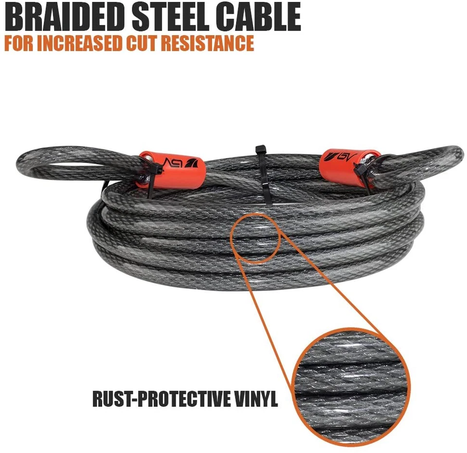 BV 30FT Security Steel Cable with Loops, Flex Cable, Lock Cable 3/8 Inch, for U-Lock and Padlock Description Color 30FT Finish Type Painted Brand BV Material Galvanized Steel Special Feature Cut Resistant Flex Cable Length: 30-feet & Thickness: 3/8-inch ; (910 cm x 10 mm) Double looped cable compatible with all kinds of padlocks, disc locks, and U-locks Ideal for locking bicycles cars, motorcycles, and all kinds of large equipment Reinforced cuff over crossbar and cylinder for added security Braided steel cable with rust-protective vinyl increase cut resistance BV Flex Cable - Compatible with U-lock, Disc Lock, and Padlock A perfect solution for security purpose. Ideal for bicycles, motorcycles, cars, and all kind of large equipment. Rust and Cut Resistant Vinyl coated braided steel with sealed looped ends increase the cut resistance of the flex cable. Availability: 4-feet x 3/8-inch ; (120 cm x 10 mm) 7-feet x 3/8-inch ; (280 cm x 10 mm) 15-feet x 3/8-inch ; (465 cm x 10 mm) 30-feet x 3/8-inch ; (930 cm x 10 mm)
