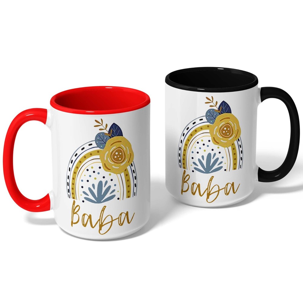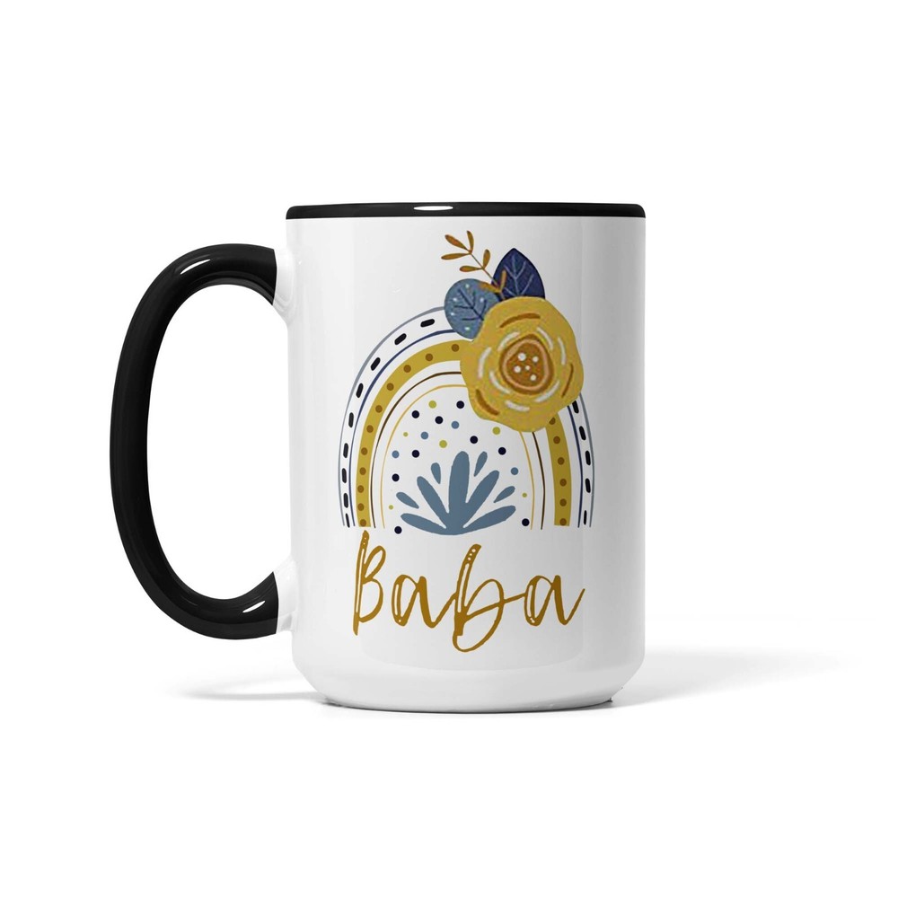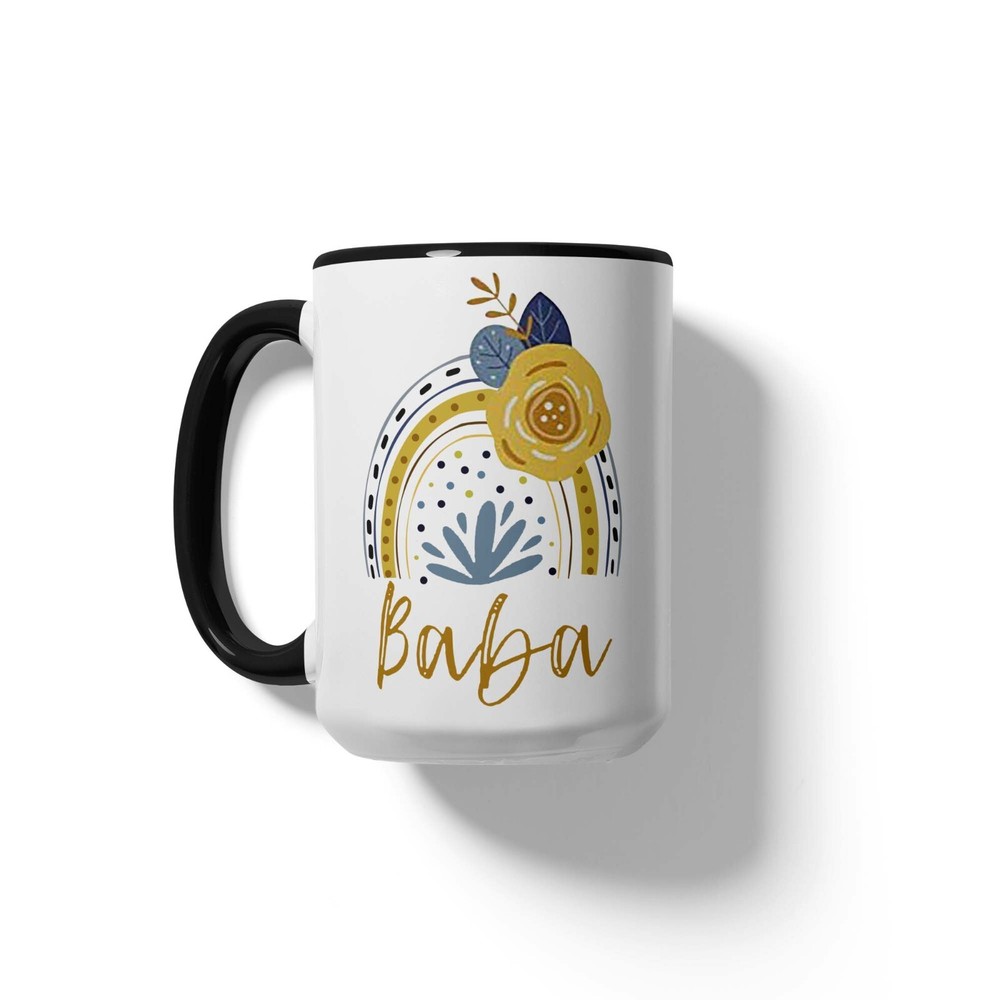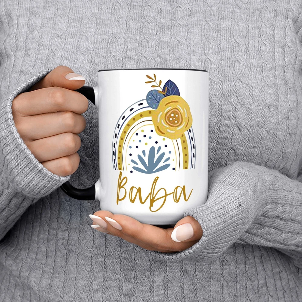 The Baba Rainbow Mug is a novelty coffee mug with a unique design featuring a rainbow pattern, making it a perfect gift idea for Ukrainian grandmas. Crafted from ceramic and with a capacity of 11oz, this white mug stands at 3.75 inches tall and 3.14 inches wide. Proudly made in the United States, this special mug is ideal for enjoying a cup of coffee or tea while celebrating a new pregnancy or baby reveal.