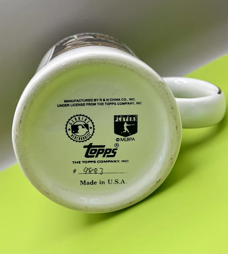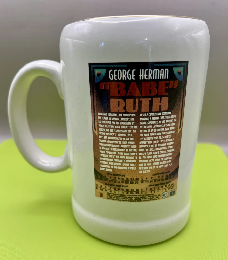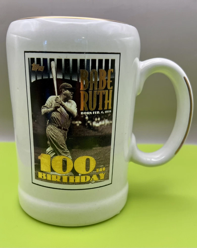 This is a vintage 1995 Babe Ruth 100th Birthday collectors mug featuring the New York Yankees. It is officially licensed by Topps and commemorates Ruth's birthday. The mug is from the United States and is numbered #4883. This item is a must-have for baseball fans and collectors of sports memorabilia.