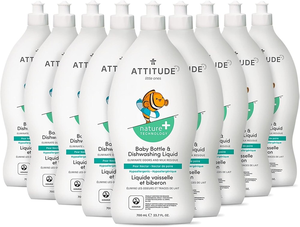 Baby Dish Soap and Bottle Cleaner, EWG Verified Dishwashing Liquid, No Added Dyes or Fragrances, Tough on Milk Residue and Grease, Vegan, Pear Nectar, Fl Oz Pack of 9 EWG VERIFIED: Clean ingredients and full transparency NATURAL ORIGIN: Made with ≥ 97 % naturally sourced ingredients SATISFACTION GUARANTEE: Dermatologically tested EASY RECYCLABLE PACKAGING: Bottle made from easily recyclable HDPE #2 plastic PETA CERTIFIED: 100% vegan and cruelty-free Our dishwashing liquid contains no added dyes. Its formula is tough on dirt and grease but soft enough to use on your little one’s dishes. The velvety white musk gives the fragrance its subtle warmth and enveloping softness that combines with its delectably fruity apple notes. The bottle is made from HDPE #2 plastic—the easiest plastic to recycle—and can be reused again and again thanks to our innovative eco-refills. Its vegan and cruelty-free formula leaves your dishes clean and sparkling every day.