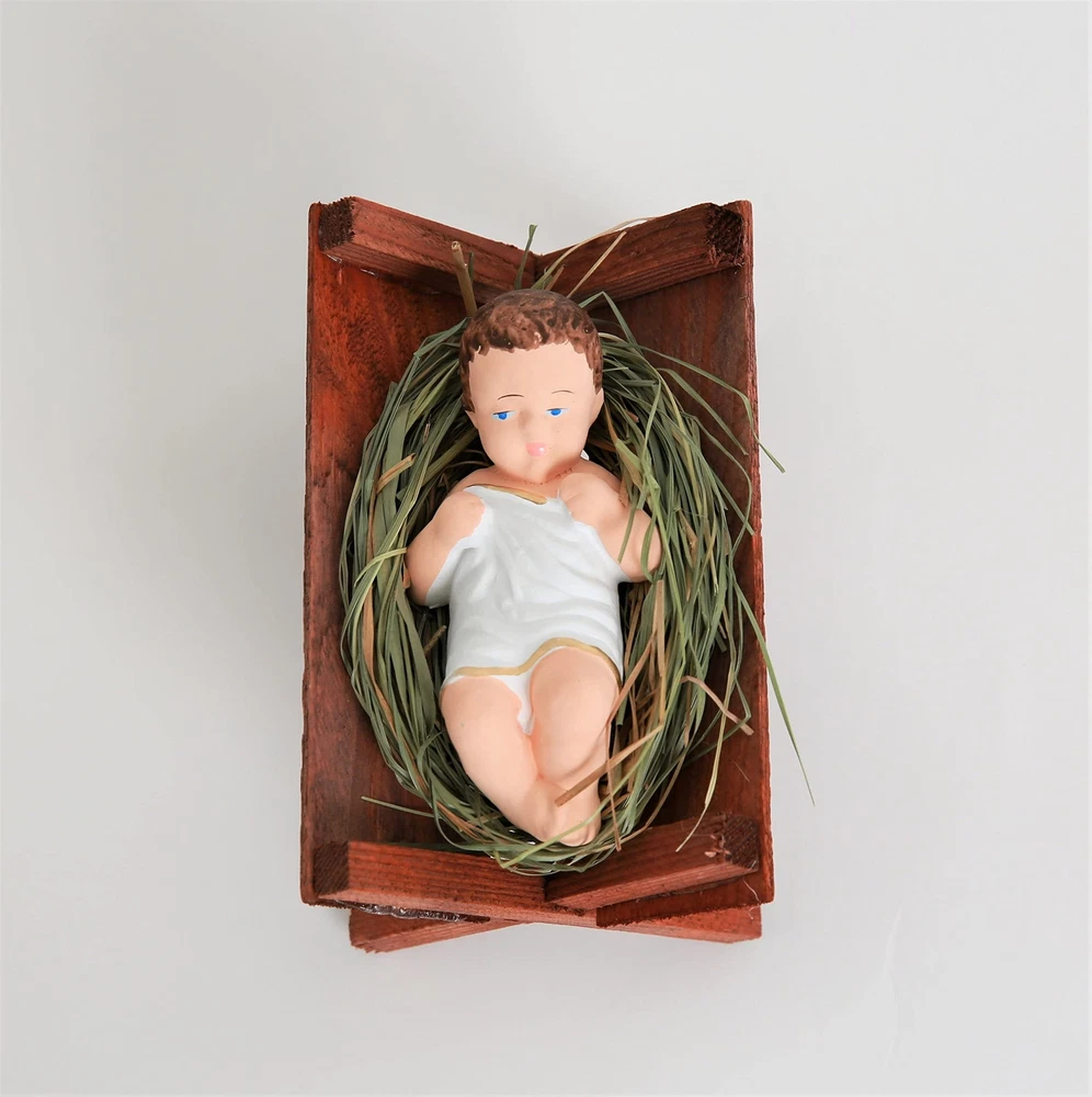 Bring joy, peace and love to your home for the holidays with this beautiful handmade baby Jesus laying on natural hay in wooden crib. Made of gypsum and beautifully hand painted. The perfect Baby Jesus for any nativity scene! Complete your Christmas nativity scene set with this adorable figurine - can be removed from manger. Hand crafted Christmas decoration for nativity scenes and other Christmas related projects Handmade in Poland gowned infant Jesus in manger laying on natural hay Provides festive charm and brings joy to your home this holiday season Great addition for your nativity scene during holidays or for a church display