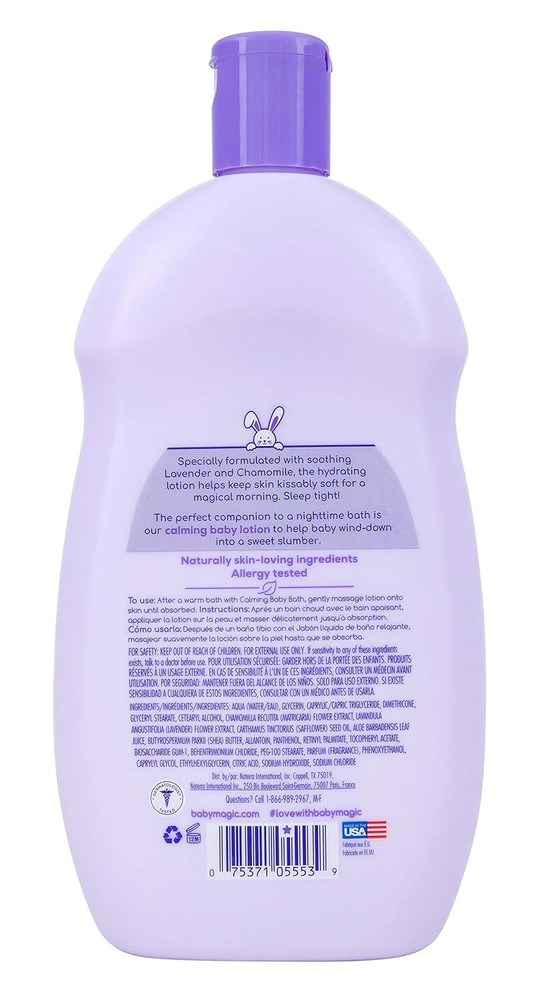 Baby Magic Calming Lotion | Helps Comfort and Relax 16.5 Fl Oz (Pack of 6) Product Details Product Dimensions : 8 x 6 x 8.5 inches; 7.5 Pounds Item model number : 705553 Manufacturer : Naterra International Inc. Country of Origin : USA Brand: Baby Magic Item Volume: 16.5 Fluid Ounces Item dimensions L x W x H: 8 x 6 x 8.5 inches Age Range (Description): Newborn,Infant,Toddler, child Special Feature: Hypoallergenic, Calming Use Baby Magic Lavender And Chamomile Lotion as part of your bedtime routine to help whisk baby away into a sweet slumber and stay asleep longer. Nighty-night! Each Baby Magic product is specially formulated for baby’s sensitive and delicate skin. Featuring nourishing formulas, comforting scents, and wholesome ingredients. To use: Gently massage Baby Magic Lavender Baby Lotion all over baby's body to soothe and relax. Apply lotion after using Baby Magic Lavender and Chamomile nighttime baby bath to complete your bedtime routine. Baby Magic Calming Lotion contains no parabens, phthalates, dyes and or sulfates. Dermatologist recommended and hypoallergenic for the sensitive skin of infants, from newborns to toddlers. Made in the USA, Baby Magic is a family-owned and operated business that has been delivering quality products at an affordable price to loving parents for more than 70 years. The perfect companion to a nighttime bath is calming baby Lotion to help baby wind-down into a sweet slumber. Specially formulated with soothing Lavender and Chamomile, the hydrating lotion helps keep skin kissably soft for a magical morning. Sleep tight!