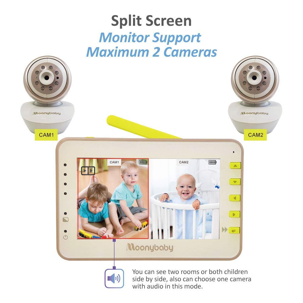 【Split Screen & Audio for one chosen camera】: With split-screen, you can see two rooms or both children side by side; you won't miss any precious moments. The best is you also can choose one camera with audio in this mode. 【Remote Pan, Tilt, Zoom】 Use parent unit to control the camera to pan, tilt and zoom remotely, you could see your little one no matter where he/she is in the room. 【100% DIGITAL WIRELESS SECURED TECHNOLOGY】 ensures private and secure connection between the camera and the monitor. The 2.4Ghz interference-free signal works in home between rooms and upstairs/downstairs. No WIFI/INTERNET setup required. 【TWO WAY TALK BACK】: With TALK BACK button, you can talk to your partner or baby when they need you. 【TWO CAMERAS HAVE BEEN PAIRED TO MONITOR & RICH FEATURES】Don't bother to move camera to another room when you move baby. Use Scan mode or TWO SPLIT SCREEN view to view two cameras. Rich Features: Colorful night light, Clear night vision, Long battery life, Two way talk back, Baby room temperature monitoring, 5 built-in lullabies, Zoom in and Power saving/Voice activation mode, Scan mode, Camera wall mount ready.