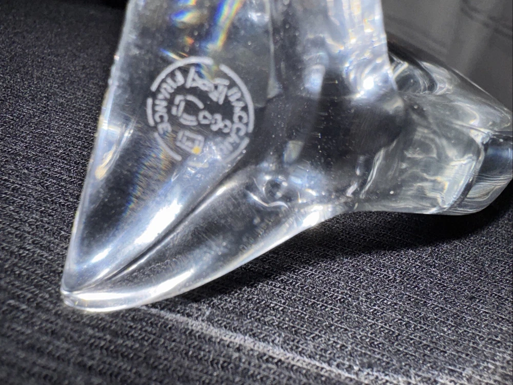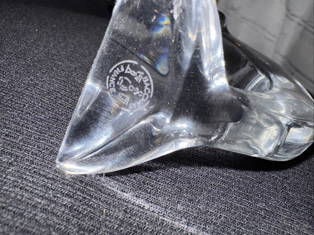 This exquisite Baccarat Crystal figurine depicts a playful dolphin in mid-air, leaping out of the water. Crafted in France, this medium-sized piece is made of clear glass and crystal, with intricate details and sparkling crystals that add a touch of elegance to any room. The figurine is perfect for all occasions and can be displayed in any room of your home, making it a great addition to your collection of decorative collectibles. The Baccarat brand is known for its quality and this piece is no exception. The dolphin subject is beautifully captured, with a unique design that will make it stand out in any collection. The figurine comes unboxed and is suitable for adults. With its stunning features and impressive size, this Baccarat Crystal France Arched Leaping Playing Dolphin Figurine is sure to be a conversation starter. Excellent condition with no chips, cracks. No box.