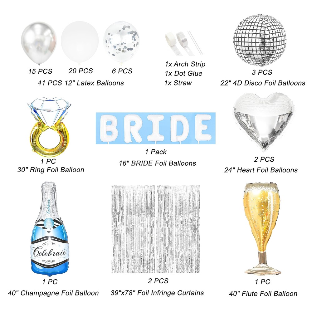 Bachelorette Party Decorations Kit Bridal Shower Balloons Arch Kit Silver Foil Fringe Backdrop Curtains for Retro Boogie Disco Bachelorette Party Decorations (Silver) Perfect for any bachelorette party, wedding shower, engagement party or bridal shower Package includes: 35 PCS 12" latex balloons, 6 PCS 12" confetti balloons, 16” white letter balloon , 2 heart balloons, 3 disco balloons, 1 Champagne Bottle balloon, 1 Flute Balloon and 1 Ring Balloon, 2 foil infringe curtains,1 balloon arch strip, 1 glue tape, 1 straw Easy to put together: balloon arch strips make it easy to DIY the Balloon Garland, a plastic straw to assist with blowing the foil balloon up Balloon colors: White, Silver Chrome, Silver confetti Perfect for any bachelorette party, wedding shower, engagement party or bridal shower Note: It is inevitable that some balloons will have some smell because of the images printed on them. Please allow smelly balloons to air out for a few days and the smell will disappear Shipping from the USA All of our products are shipped from the USA, ensuring quick delivery to your destination. Payment We offer the following payment methods: PayPal, credit card, bank transfer, and eBay's secure payment system. Free Shipping & Free Returns Shipping within the USA is FREE. Additionally, any return is absolutely free for you. Risk-Free Purchase You have the option to return an item within 30 days without any justification. We cover the return shipping costs! Fast Shipping We ship immediately upon receipt of payment. Generally, the package is delivered within 2-3 days in the USA. If it takes longer, we will contact you. Quality and Costs Made in Europe, USA, China No customs fees or additional charges Total satisfaction guarantee Invoice with declared VAT available upon request in .pdf format Feedback Your feedback is very important to us. After you pay for your purchase, you will automatically receive positive feedback from us.