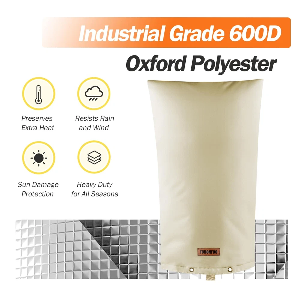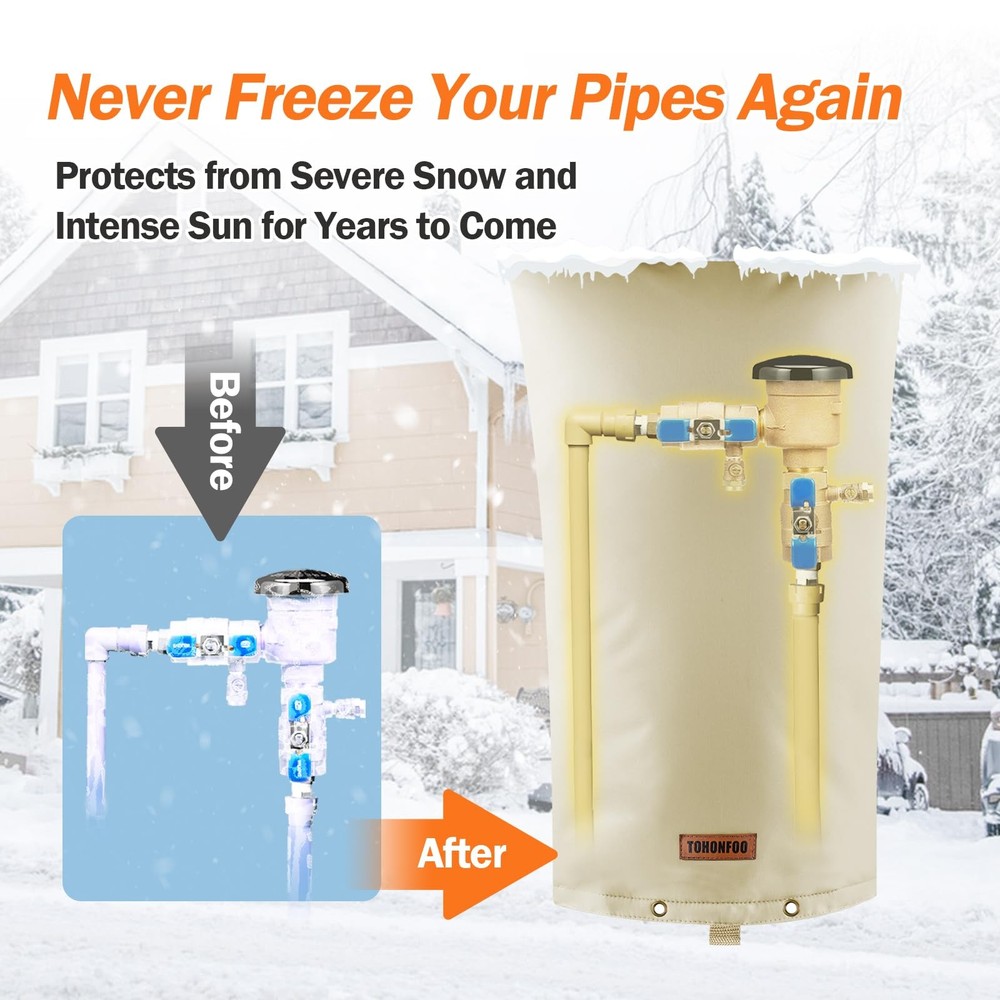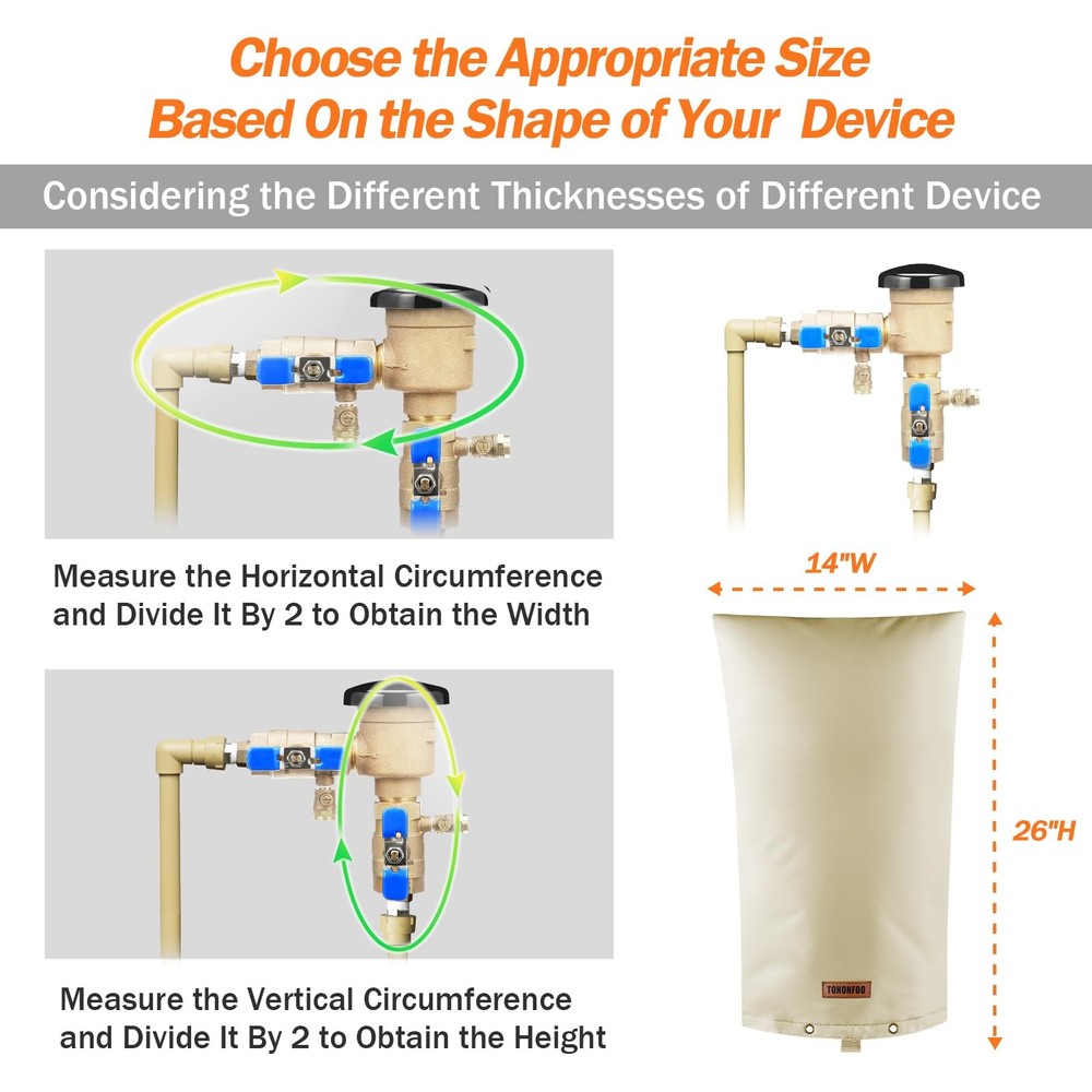 Customized Design Our Backflow Preventer Insulated Cover for the Outside is engineered to endure freezing temperatures as low as 5 degrees. Protect your Pressure Vacuum Breaker from Severe Snow and Intense Sun Package Includes 1 Pressure Vacuum Breaker Cover & Several nylon ties 5 Layers Design Insulation & Waterproof 1 Layer Waterproof Heavy Duty 600D Oxford Fabric 2 Layers Cotton Insulation 2 Layers PE Sliver Coated Cloth Windproof Velcro Put the cover on your pipes and close it with the Velcro Strips. No worry dogs to get it away and the wind blowing it away. Secure the protective cover in place tightly Anti-theft Non-rusting Brass Grommets The grommets can be locked by Chain to prevent being taken away by theft, increasing security Extra Nylon Ties We also prepared some extra nylon ties to fix it and keep your insulated pouch in place Protects From Severe Snow, Rain, Wind, Intense Sun and Heat Our High-Quality sprinkler covers for outside offer great protection from harsh snow to extreme sun and heat. Our water-resistant backflow preventer cover works well even during winds and rainstorms, it will stay snug and secure Avoid High Repair Costs Protects your backflow pipe systems from freezing, bursting, and blowouts due to severe weather conditions like snow, rain, wind, and sun exposure heating. Avoid expensive costs of valve replacement and repair every year Friendly Customer Service Please feel free to contact us if you are not satisfied with this backflow preventer insulation cover, and we will offer you a satisfactory solution within 24 hours! 【5 Layers Design Insulation & Waterproof】Made of 1 Layer of Waterproof Heavy Duty 600D Oxford Fabric, 2 Layers of Cotton Insulation, and 2 Layers PE Sliver Coated Cloth that make it guard against severe weather. Our sprinkler cover for outside is engineered to endure freezing temperatures as low as 5 degrees. We recommend draining the system to winterize or prevent unknown cold weather. 【Measure Before Purchase】The size of this sprinkler backflow cover for winter is 14"W x 26"H. Considering the Different Thicknesses of Different Equipment, measure the Horizontal Circumference and Divide It By 2 to Obtain the Width, and measure the Vertical Circumference and Divide It By 2 to Obtain the Height. Please choose the appropriate size based on your device. 【Avoid High Repair Costs】Protects your backflow pipe systems from freezing, bursting, and blowouts due to severe weather conditions like snow, rain, wind, and sun exposure heating. Avoid expensive costs of valve replacement and repair every year. 【Easy To Install and Stay Sturdy】Put the cover on your backflow preventer and pipes then close it with the Velcro Strips. We also prepared some extra nylon ties to fix it and keep your insulated pouch in place. The grommets also can be locked by Chain to prevent being taken away by theft, increasing security. 【Multipurpose】Our Pipe Insulation Cover works well as a Back Flow Preventer Cover, Sprinkler System Cover, Irrigation System Cover, Well Head Cover Vacuum Breaker Cover, Hose Bib Cover, Well Filter Cover, etc. Protect your device from Severe Snow and Intense Sun.