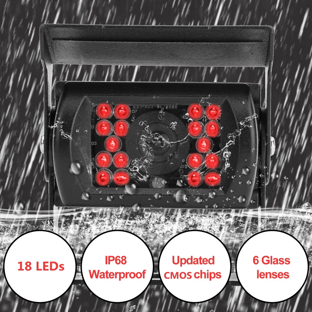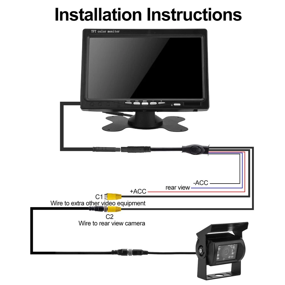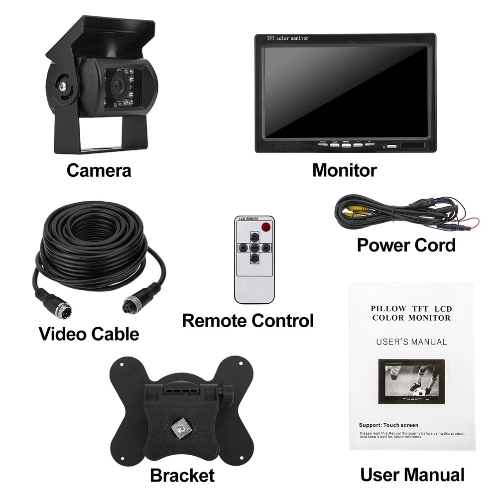 [Full Set of Backup System] - 18 LED Night Vision Reverse , 7" Color TFT LCD Monitor, 4 Pins Connector Cable. Great wired backup kit with 7 inch monitor, specially designed for most 12V 24V large vehicles, such as truck, RV, travel trailer, camper, tractor, bus, lorry, etc. [7 Inch Screen Rear view Monitor] - 7-inch wide viewing angle 16:9 display mode, adjustable image brightness/color/contrast, 2-channel video input, remote control switch display mode. Image can be rotated horizontally and vertically for mirror or normal viewing. [Stable Image Output] - The performance of this device has a remarkable field of view, clarity and color. Compared to wireless cameras, this wired backup kit features more stable, not susceptible to signal interference. [Super Night Vision] - With 18 super bright led lights, stronger night view than normal led or normal . Even at night the provides a very clear view to help you see more clearly in dark road or underground parking lot. [IP68 Waterproof Rear View ] - IP68 standard waterproof. ABS plastic housing, effectively prevent water from penetrating into the . No worry about the fog or mist inside, the even works well at rainy day.