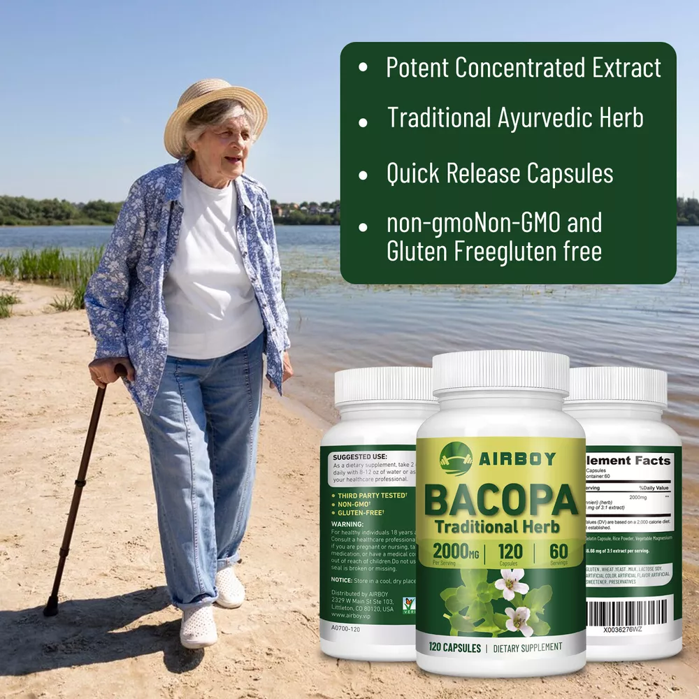 Effects: Brain & Nervous System Health, Memory Support Ingredients: Bacopa Monnieri Directions: Take 2 capsules once daily after a meal. Shipping: Ships within 48 hours on working days. Shelf life: 2 years Description: Bacopa Extract Formulated with Airboy is Herbal Supplement, Supports Memory and Cognitive Performance Suitable for Vegetarians and Vegans. Formulated without Gluten, GMOs, or Soy Produced in a 3rd Party Audited GMP Registered (Certified) Facility. Research of this herbal supplement suggests that it may help improve many areas of cognitive performance, including visual processing, learning rate, working memory, and information retention. Document