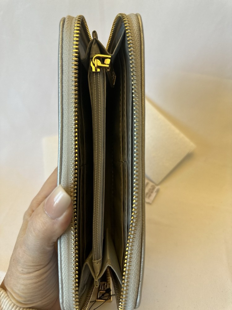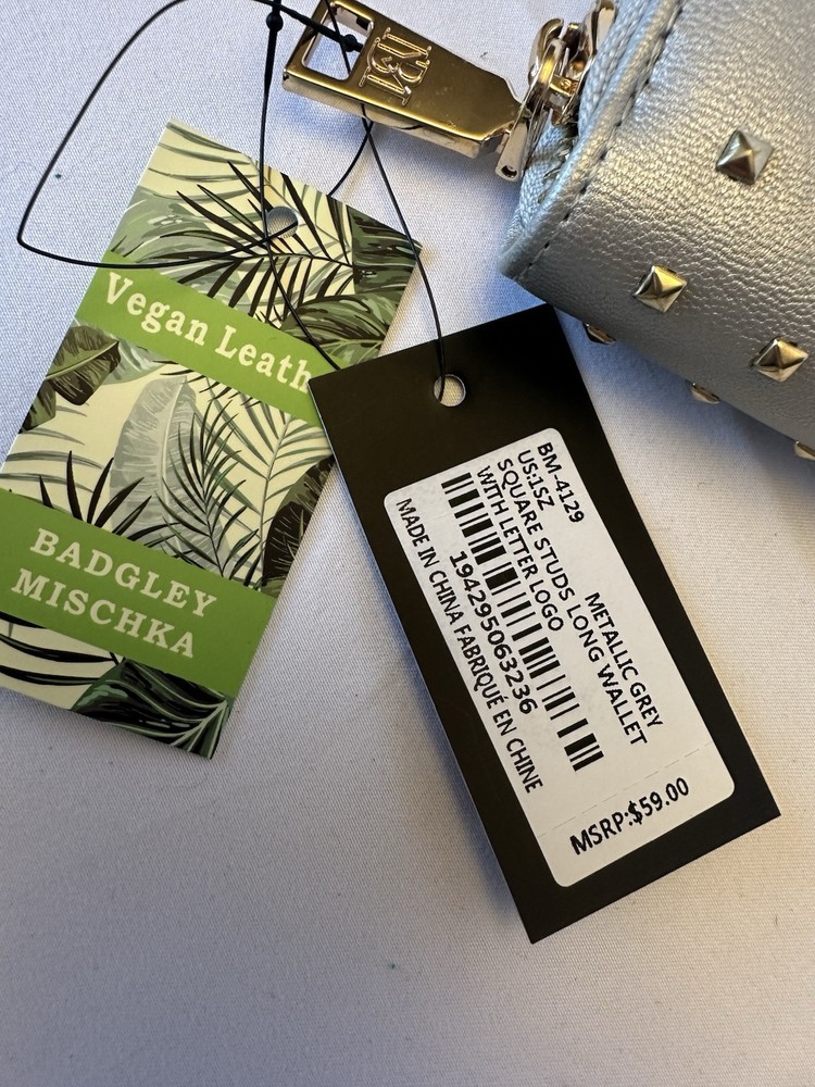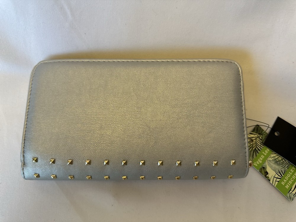 This elegant Badgley Mischka silver zipper wallet features a zip-around style with gold stud accents, perfect for holding credit cards. The wallet measures 8 inches in length and 5 inches in width, making it a stylish and functional accessory for everyday use. Brand-new with tags, this wallet is a luxurious addition to any wardrobe. $59 retail