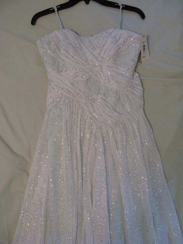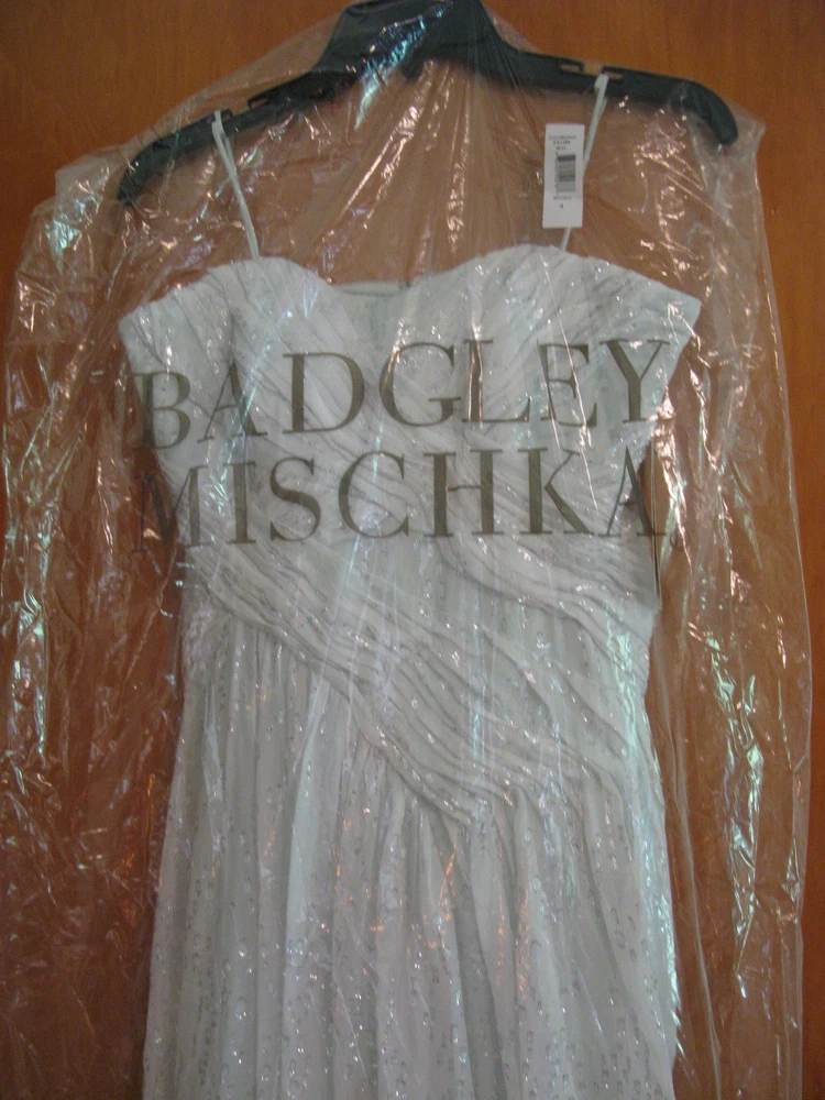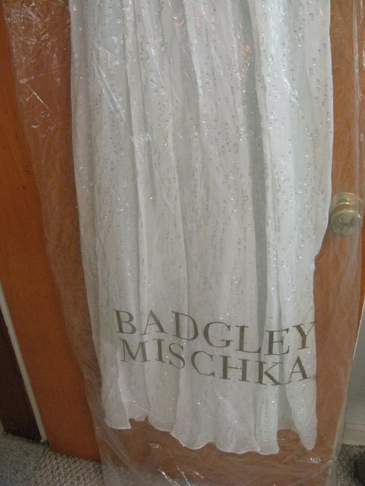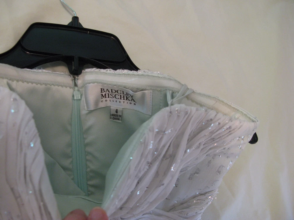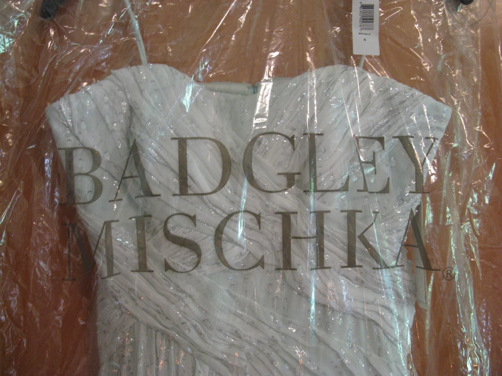 Welcome to my Auction! Up for bidding is a gorgeous silk gown from designer Badgley Mischka. This elegant and ethereal design is perfect for any dressy occasion! Features a beautiful pleated and wrapped bodice design, sheer white silk shell that is suffused with silver threads for a magical shimmering look, soft mint color poly lining (layered twice in the skirt to give fullness and movement), light boning in the bodice for flattering shape and back zipped closure with hook & eye. Brand new with tags - and retail of $990.00 - this is the dress you've been dreaming of for your wedding, prom or special events! Size is marked '4' - but could also work for a larger size 2, or small size 6 Please check measurements as follows: 53 inches long from center of neckline to hem (comes to a slight train of 57 inch length in back), 30 inches in bust (best fits bust 32-34 inches), 40 inches in hips, 30 inches in waist. Please ask all questions before bidding - serious buyers only. I will report non-paid items to ebay. Please be considerate and make sure you can complete your sale. Returns are accepted only in cases of items not being as described or wrong item sent. I cannot accept returns of used cosmetics. I am an individual seller - not a department store. Processing returns is time-consuming and costly. Ebay takes a percentage of every sale, so I cannot refund shipping costs. Be sure you like the color, check the size, ask questions etc. to ensure you will be pleased with your purchase. Thank you for visiting and good luck!