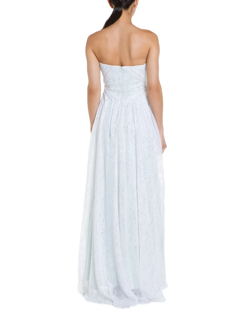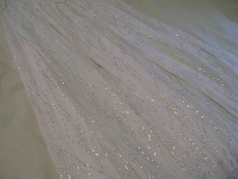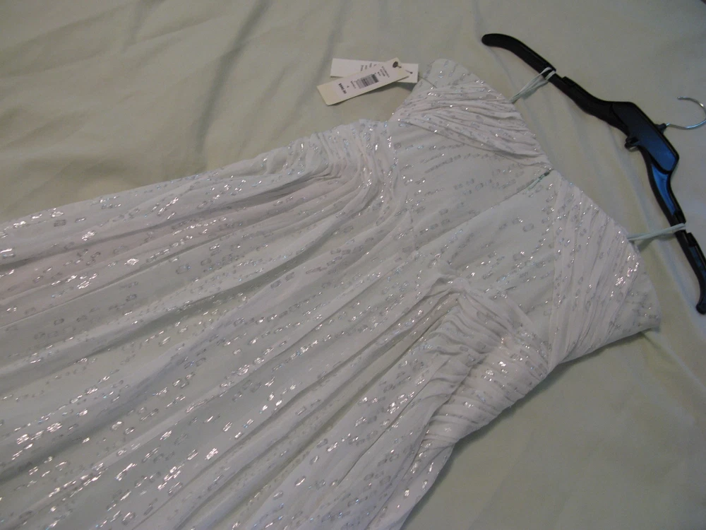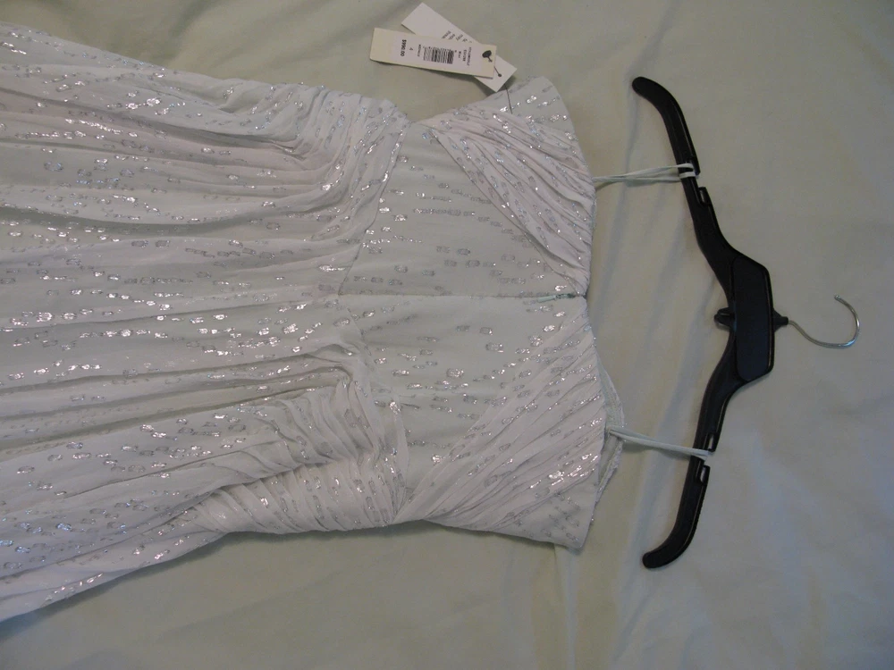 Welcome to my Auction! Up for bidding is a gorgeous silk gown from designer Badgley Mischka. This elegant and ethereal design is perfect for any dressy occasion! Features a beautiful pleated and wrapped bodice design, sheer white silk shell that is suffused with silver threads for a magical shimmering look, soft mint color poly lining (layered twice in the skirt to give fullness and movement), light boning in the bodice for flattering shape and back zipped closure with hook & eye. Brand new with tags - and retail of $990.00 - this is the dress you've been dreaming of for your wedding, prom or special events! Size is marked '4' - but could also work for a larger size 2, or small size 6 Please check measurements as follows: 53 inches long from center of neckline to hem (comes to a slight train of 57 inch length in back), 30 inches in bust (best fits bust 32-34 inches), 40 inches in hips, 30 inches in waist. Please ask all questions before bidding - serious buyers only. I will report non-paid items to ebay. Please be considerate and make sure you can complete your sale. Returns are accepted only in cases of items not being as described or wrong item sent. I cannot accept returns of used cosmetics. I am an individual seller - not a department store. Processing returns is time-consuming and costly. Ebay takes a percentage of every sale, so I cannot refund shipping costs. Be sure you like the color, check the size, ask questions etc. to ensure you will be pleased with your purchase. Thank you for visiting and good luck!