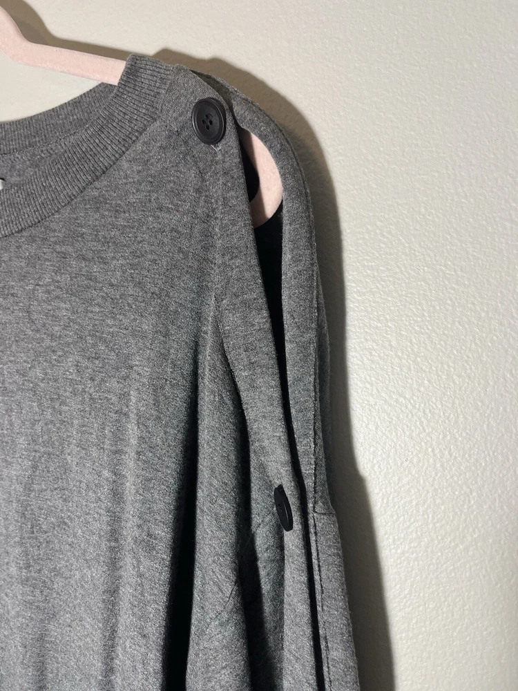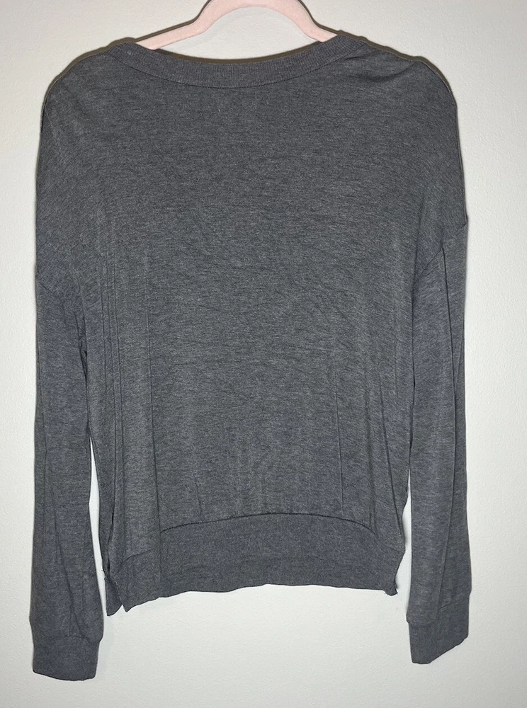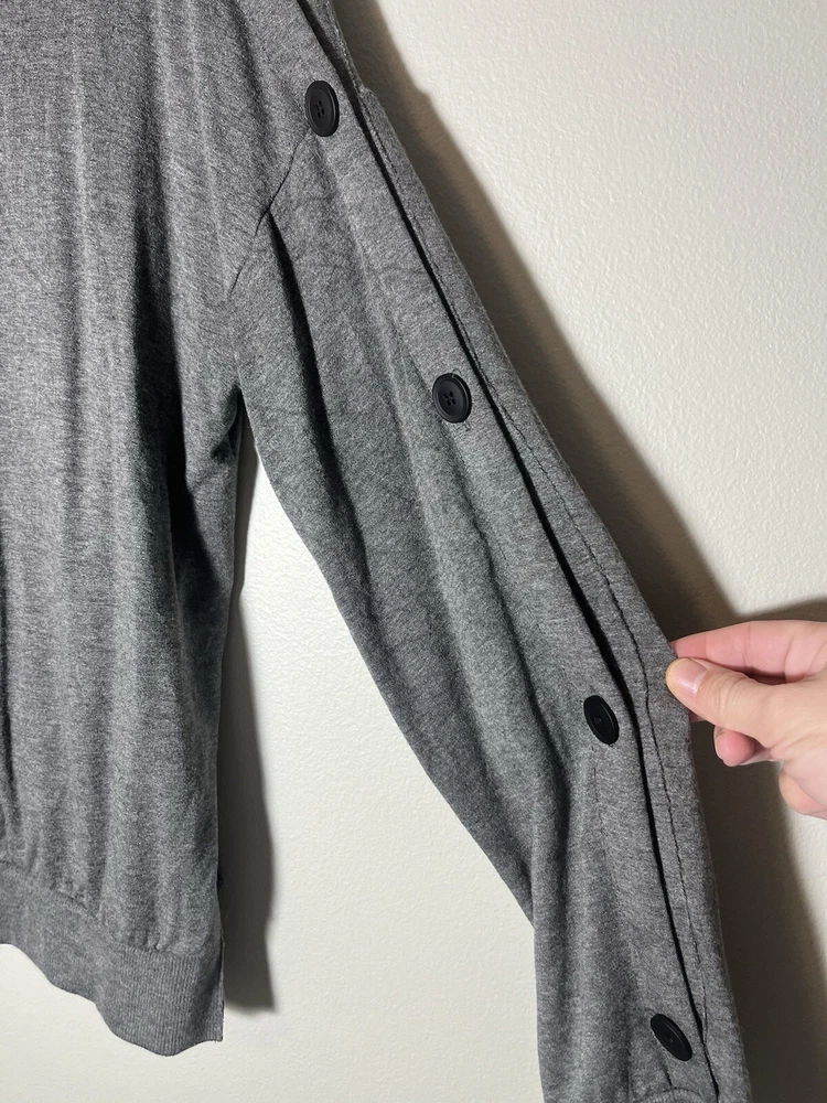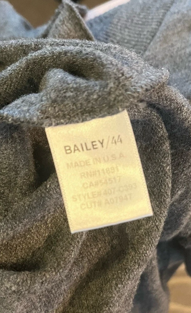 Preowned Bailey 44 top with buttons on sleeves in a size Medium. Great condition. Length 26 in PTP 19 in This Bailey 44 blouse is a perfect addition to your wardrobe. The lightweight and comfortable material is a modal blend with spandex, making it perfect for any season. The gray color and solid pattern make it versatile for any occasion, whether it's casual, workwear, or a party. The round neck and button accents add a touch of designer style, while the tunic shape and long sleeves provide comfort and practicality. This blouse is made in the United States and is available in size medium.