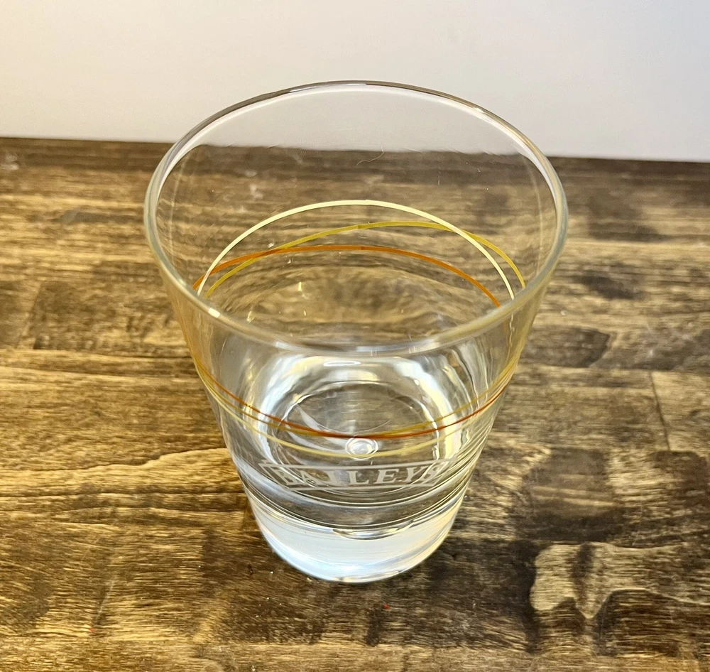 Baileys Irish Cream Highball Glass Bubble Bottom Intertwined Colored Circles 8 oz. Bailey's bubble bottom highball glass with gold and tan elliptical stripes design. These are heavy glasses with a controlled bubble in the center of the bottom. Size:3”w x 4.25” Condition: Great condition. No chips or cracks and the colors are not faded.