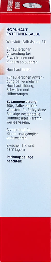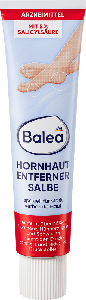 Specially formulated for severely callused skin, this salve removes excessive callous, corn, and callus build-up. Alleviates pressure pain and reduces pressure sores with regular use. Features 5% Salicylic Acid as its active ingredient, making it a powerful exfoliant. Intended for external use on areas with excessive callous build-up, corns, and calluses. The Hornhaut Entferner Salbe is a medicated salve containing 5% Salicylic Acid, designed for external use on severely callused skin, corns, and calluses. Regular application helps remove excess callous build-up, alleviate pressure pain, and reduce pressure sores. Please do not use this product if you have impaired kidney function, are a baby or toddler. For more information, you can download the product's leaflet in PDF form.