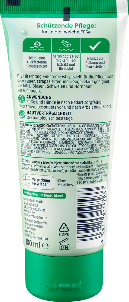 The Hirschtalg foot cream by Balea helps prevent blisters and calluses with the help of chamomile extract and bisabolol. Ideal for diabetics, this cream forms a protective and moisturizing layer on the skin. Made with a soothing blend of chamomile extract, aloe vera, and rosemary oil, this cream aids in skin regeneration and protection against friction and pressure. This formula is free from microplastics and water-soluble synthetic polymers. The Hirschtalg foot cream by Balea offers comprehensive care for very rough and strained skin. It is perfect for diabetics and helps prevent blisters and calluses with its re-fattening formula. Simply apply the cream to feet and hands as needed, especially before and after work or sports. This product is made in Germany.