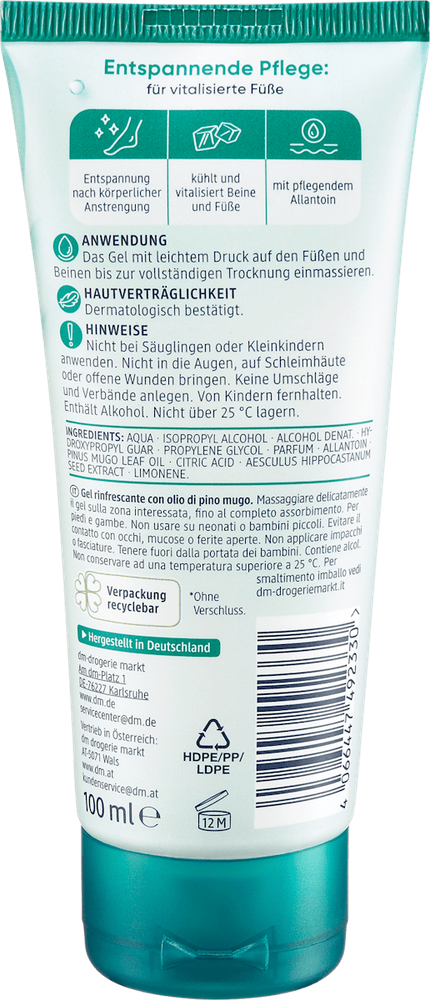 Soothing foot cream with Allantoin that cools and revitalizes legs and feet Formulated without microplastics and water-soluble rein synthetic polymers Suitable for diabetics and provides relaxing care after physical exertion The Balea Latschenkiefer Aktiv Gel foot cream is enriched with pflegendes Allantoin to provide revitalizing care for your feet. The formula is free from microplastics and water-soluble rein synthetic polymers, making it a great choice for those with diabetes. Simply massage the gel into your feet and legs until fully absorbed for a cooling and soothing sensation after physical exertion. Ingredients: AQUA, ISOPROPYL ALCOHOL, ALCOHOL DENAT., HYDROXYPROPYL GUAR, PROPYLENE GLYCOL, PARFUM, ALLANTOIN, PINUS MUGO LEAF OIL, CITRIC ACID, AESCULUS HIPPOCASTANUM SEED EXTRACT, LIMONENE. Made in 76227 Karlsruhe, Freudenstadt.