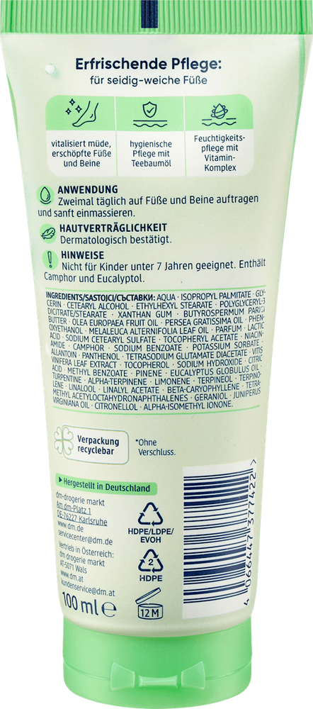 Refreshing cream specifically formulated for feet, providing intense hydration Enriched with red wine leaf extract for soft and smooth feet Contains natural ingredients like Melaleuca alternifolia (tea tree) leaf oil and Eucalyptus globulus oil Suitable for adult use, not recommended for children under 7 years of age due to the presence of Camphor and Eucalyptol This product is a refreshing foot cream that provides intense hydration, helping to keep feet soft and smooth. The cream is enriched with red wine leaf extract, known for its soothing properties. Additionally, it contains natural ingredients such as Melaleuca alternifolia (tea tree) leaf oil and Eucalyptus globulus oil, which are known for their beneficial effects on the skin. It is important to note that this product is not suitable for children under 7 years of age due to the presence of Camphor and Eucalyptol. The cream is produced in Germany, in the city of Karlsruhe, following the highest quality standards. Please refer to the ingredient list for a detailed overview of all the components. INGREDIENTS: AQUA, ISOPROPYL PALMITATE, GLYCERIN, CETEARYL ALCOHOL, ETHYLHEXYL STEARATE, POLYGLYCERYL-3 DICITRATE/STEARATE, XANTHAN GUM, BUTYROSPERMUM PARKII BUTTER, OLEA EUROPAEA FRUIT OIL, PERSEA GRATISSIMA OIL, PHENOXYETHANOL, MELALEUCA ALTERNIFOLIA LEAF OIL, PARFUM, LACTIC ACID, SODIUM CETEARYL SULFATE, TOCOPHERYL ACETATE, NIACINAMIDE, CAMPHOR, SODIUM BENZOATE, POTASSIUM SORBATE, ALLANTOIN, PANTHENOL, TETRASODIUM GLUTAMATE DIACETATE, VITIS VINIFERA LEAF EXTRACT, TOCOPHEROL, SODIUM HYDROXIDE, CITRIC ACID, METHYL BENZOATE, PINENE, EUCALYPTUS GLOBULUS OIL, TURPENTINE, ALPHA-TERPINENE, LIMONENE, TERPINEOL, TERPINOLENE, LINALOOL, LINALYL ACETATE, BETA-CARYOPHYLLENE, TETRAMETHYL ACETYLOCTAHYDRONAPHTHALENES, GERANIOL, JUNIPERUS VIRGINIANA OIL, CITRONELLOL, ALPHA-ISOMETHYL IONONE. 76227 Karlsruhe Deutschland
