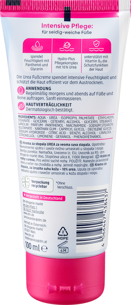 Formulated with 10% Urea to provide intense moisture for very dry feet Suitable for diabetic individuals, helping to reduce tension feelings Enriched with HydroPlus-CareComplex, including Panthenol and Glycerin to pamper and soften foot skin Free from microplastics and water-soluble synthetic polymers The Balea Urea Foot Cream is a must-have for those with extremely dry feet, including diabetic individuals. This nourishing cream, made in Germany, offers a rich formulation of 10% Urea, Panthenol, and Glycerin, which work together to provide intense hydration and soften the skin. The creme also features Vitamin B3 to support the skin's natural protective barrier, locking in moisture and alleviating dryness and tension. With its easy-to-spread, quick-absorbing texture, this foot cream is free from microplastics and water-soluble synthetic polymers, ensuring a safe and eco-friendly choice for foot care.