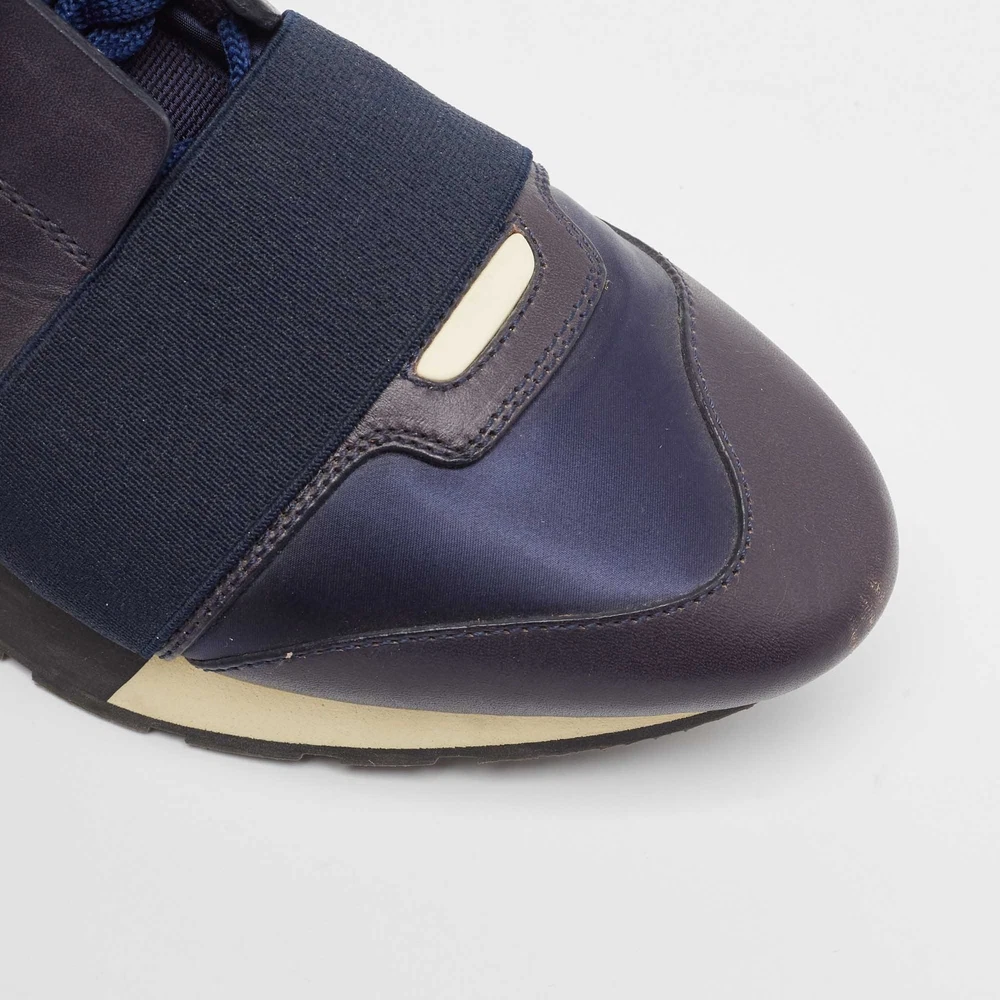 Our eBay Store About Us Contact Us Add to Favorite Sellers Balenciaga Navy Blue Fabric and Leather Race Runner Lace Up Sneakers Size 37 Elevate your footwear game with these Balenciaga sneakers. Combining high-end aesthetics and unmatched comfort, these sneakers are a symbol of modern luxury and impeccable taste. Product Details Brand Balenciaga Color Navy Blue Includes The Luxury Closet Packaging Outsole Length 27 cm Outsole Width 8 cm Size 37 Certified by The Luxury Closet This item has gone through a detailed authentication process overseen by our experts. We offer a lifetime guarantee of authenticity on all our items. How We Check The in-house team of experts at The Luxury Closet is highly trained to verify the authenticity and the condition of the luxury products. They ensure that only 100% authentic items are put on sale.The evaluation process is unique with its own mix of assessment criteria and differs according to the category. Each item is evaluated based on the following combination of hallmarks, hardware, stitching, symmetry, material, craftsmanship, stamping, codes, hologram stickers, and packaging. Our authenticators also check if the items have been modified or amended (e.g., aftermarket diamonds, replaced batteries, repaired bags, etc.) International Buyers Import duties, taxes and charges are not included in the item price. These charges are the buyers responsibility. Please check with your country’s customs office to determine what these additional cost will be prior to buying.