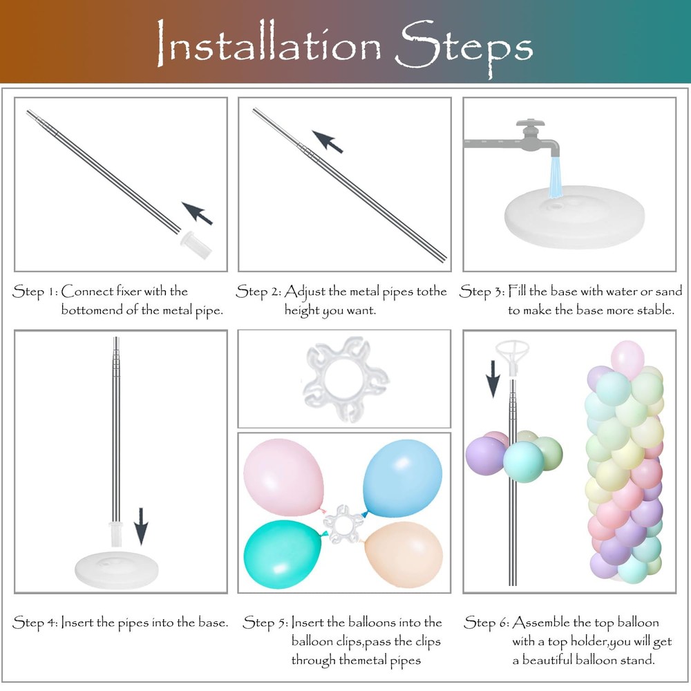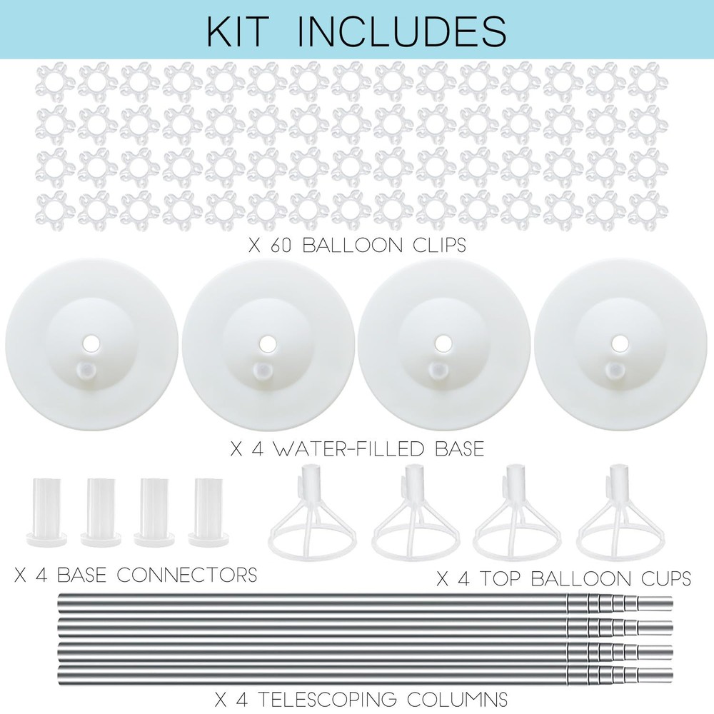 Balloon Column Kit Set of 2 CREATE STUNNING DECORATIONS: Make your parties unforgettable with this balloon stand kit that includes 4 telescopic metal stick,4 top balloon holder,60 Balloon rings,4 water/sand fillable bases. (Balloons not included) QUICK AND EASY ASSEMBLY: No more struggling with complicated balloon tower stands. With this kit, you can assemble balloon towers in just a few minutes. CUSTOMIZABLE HEIGHT: The telescopic design allows you to adjust the height of the balloon column stand from 20” to 80”, making it perfect for any occasion. DURABLE AND STABLE: Made with high-quality PVC and stainless metal, this balloon stand kit is sturdy and won't break easily. We've also improved the thickness of the telescopic metal stick to make it more durable and less likely to deform. VERSATILE DECORATION: Perfect for birthdays, weddings, graduations, baby showers, gender reveal parties, Christmas, and more. Make your events unique with this balloon stand kit.