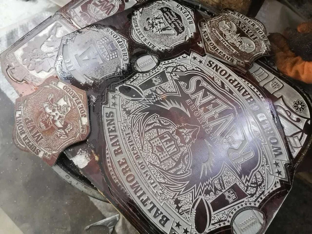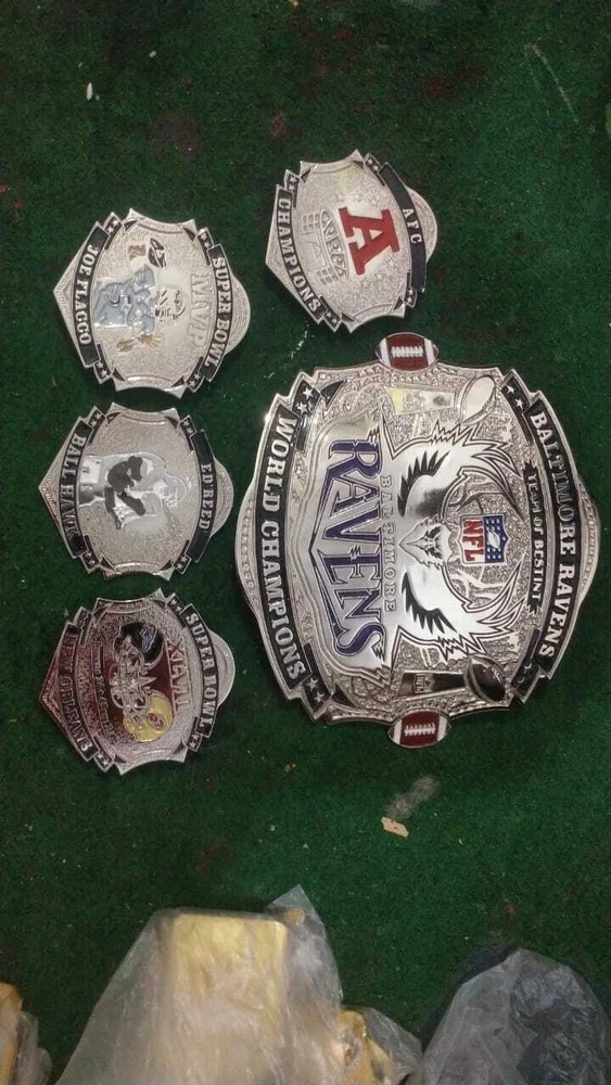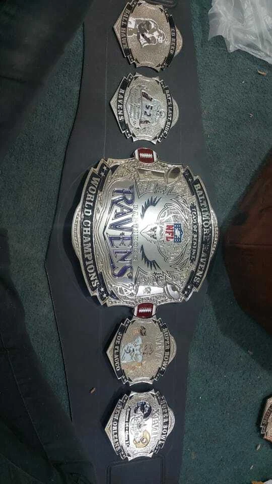 Welcome to our shop ------------------------------------------- We are specialist in manufacturing handmade products:: Our wide range of products include: >>>>Championship Belts WWE | WWF | AEW | UFC | WBC | WCW Product Description PICTURES ARE OF 4MM ZINC BELT ** Baltimore Ravens Championship Belt *** Plate Metal: Brass (Zinc available on request with additional cost) Strap: 100% Leather Largest Waist Size: Fits upto 46'' Belt Length: ~50" Weight: 4.17 lbs | 2.01 Kg Plate Thickness: 2mm (4mm Version available on demand with additional cost) ::The belt is well crafted and manufactured to meet the quality demands of fans:: Get your hands on this marvelous piece now! Note: If you need further details kindly inbox us, we will try to be as responsive as possible. ------------------------------------------- Return Policy: Generally we don't have much complains on our products and we make sure to 100% satisfy our clients. We send the product in well Bubble Wrapped packaging so there is highly unlike chance of getting damaged item. In case there is a damage, we will try to give partial refund or you can ask for full refund within 30 days after returning the belt to origin. NOTE: 1. If you have placed the order by mistake or you have purchased a wrong item then we are not going to refund that. 2. Buyer will pay the shipping fee of returning the belt. ------------------------------------------- Happy Shopping! :)