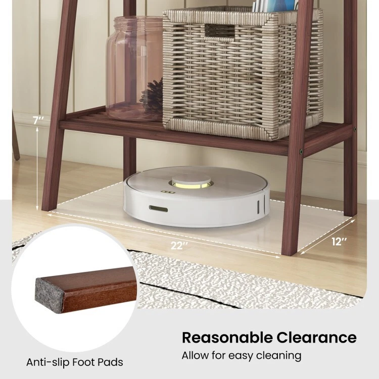 Bamboo Ladder Bookshelf 4-Tier Living Room Storage Organizer Display Plant Shelf ● 100% Natural Bamboo: The whole frame of this 4 tier bookshelf is made of selected bamboo material with varnish, which is burr-free for smooth touch. Therefore, you can clean it with ease. Likewise, the natural bamboo adds a rustic addition to your space. ● Spacious Storage Space: Featuring 4 shelves of different widths, this 4-tier bamboo ladder bookshelf (14" height between shelves) is carefully designed to accommodate different belongings, such as books, potted plants, ornaments, photo frames, storage baskets and sundries to keep your space tidy and clean. ● Anti-tipping Device and Reinforced Crossbars: To keep it stable for freestanding and make it safe to use, this storage display shelf is equipped with an anti-tipping device that is great for families with kids and pets. Moreover, the reinforced crossbars and anti-slip foot pads ensure additional stability. ● Hassle-free Installation: With a straightforward instruction and all necessary accessories included, the assembly of this ladder bookcase is simple for time-saving. Overall dimension: 24'' x 14'' x 58'' (L x W x H). ● Multifunctional Design: In addition to using as a ladder bookshelf in your study room, this indoor wooden furniture can be used as a storage rack in the living room, kitchen or office, a plant stand on the balcony, fully satisfying your various requirements. And the perfect size will fit different places. Color: Walnut Material: Bamboo Product Dimension: 24" x 14" x 58" Net Weight: 9 lbs Weight Capacity of the First Shelf: 22 lbs Weight Capacity of the Second Shelf: 33 lbs Weight Capacity of the Third Shelf: 44 lbs Weight Capacity of Bottom Shelf: 44 lbs