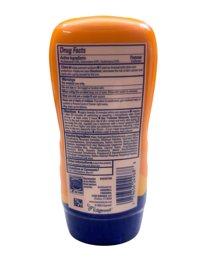 UPC:079656049688Product Line:Banana Boat Sport PerformanceIngredients:No Active IngredientsSkin Type:AllBrand:Banana BoatFormulation:LotionSize:4 Fl Oz (Pack Of 1)Active Ingredients:Zinc OxideType:Sun LotionMPN:04968gtin13:079656049688Scent:Banana