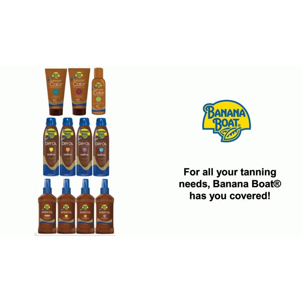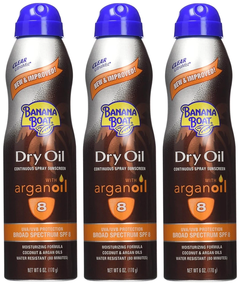 Banana Boat Tanning Dry Oil Clear Spray Sunscreen SPF8, Oxybenzone Free, 6 Ounce (Pack Of 5) Enjoy a sun-kissed glow with Banana Boat Deep Tanning Dry Oil Clear Spray Sunscreen with SPF 8. This lightweight, non-greasy dry oil tanning spray formula is made with natural argan oil and will leave your skin feeling silky-smooth. Banana Boat tanning oil with SPF is water-resistant for up to 80 minutes and features a cap-free twist 'n lock design and Ultra Mist technology for quick and easy coverage. About this item WATER RESISTANT for up to 80 MINUTES NON-GREASY and LIGHTWEIGHT FEEL Improved formula now with ARGAN OIL Broad Spectrum UVA & UVB Protection Banana Boat Tanning Spray and Dry oils provide sun protection in a variety of SPFs that will leave your skin feeling silky smooth FREE FROM–Tanning oil spray made without oxybenzone and octinoxate WATER RESISTANT for up to 80 MINUTES NON-GREASY and LIGHTWEIGHT FEEL IMPROVED FORMULA–Dry sunscreen spray made with ARGAN OIL SPF 8 Banana Boat dry oil sunscreen features a cap-free twist 'n lock design Ingredients Active Ingredients:Avobenzone 1.0%, Homosalate 3.0%, Octocrylene 2.0%Inactive Ingredients:Alcohol Denat., Isobutane, Isododecane, Diisopropyl Adipate, Mineral Oil, Lauryl PEG-8 Dimethicone, Phenylisopropyl Dimethicone, Polyglyceryl-3 Stearate/Isostearate/Dimer Dilinoleate Crosspolymer, Methyl Dihydroabietate, Caprylyl Glycol, Fragrance, Argania Spinosa Kernel Oil, Ascorbyl Palmitate, Cocos Nucifera (Coconut) Oil, Olea Europea (Olive) Fruit Oil, Tocopheryl Acetate, Vitis Vinifera (Grape) Seed Oil, Panthenol, Water, Aloe Barbadensis Leaf Extract