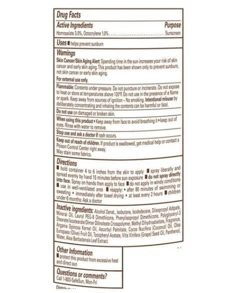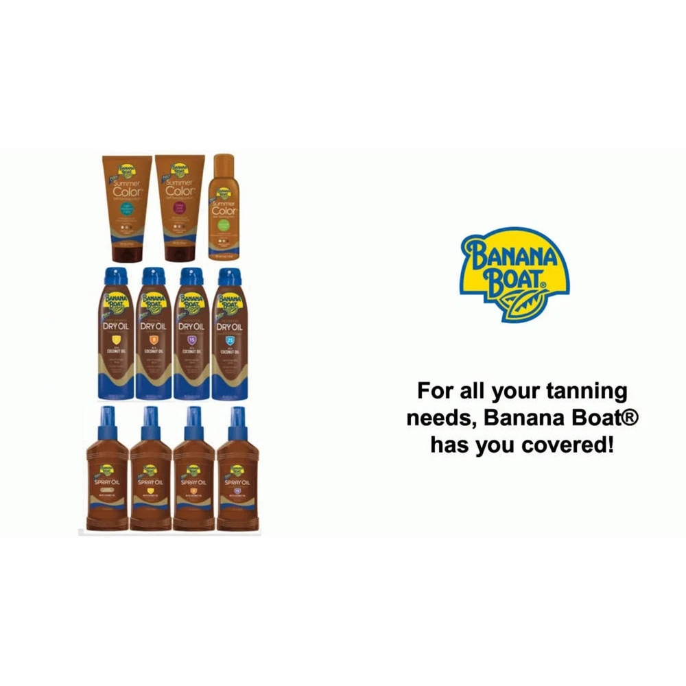Banana Boat Clear Ultra-mist Deep Tanning, Dry Oil Clear Spray Sunscreen SPF4, 6 Ounce (Pack Of 2) Enjoy a sun-kissed glow with Banana Boat Deep Tanning Dry Oil Clear Spray Sunscreen with SPF 4. This lightweight, non-greasy dry oil tanning spray formula is made with natural argan oil and will leave your skin feeling silky-smooth. Banana Boat tanning oil with SPF is water-resistant for up to 80 minutes and features a cap-free twist 'n lock design and UltraMist technology for quick and easy coverage. About this item This sunscreen offers 3-way protection with high UVB and UVA protection, guarding against sunburn, aging, and long-term skin damage. It lasts longer than ordinary sunscreens as it doesn't break down easily. This sunscreen offers 3-way protection with high UVB and UVA protection, guarding against sunburn, aging, and long-term skin damage. It lasts longer than ordinary sunscreens as it doesn't break down easily. This sunscreen offers 3-way protection with high UVB and UVA protection, guarding against sunburn, aging, and long-term skin damage. It lasts longer than ordinary sunscreens as it doesn't break down easily. This sunscreen offers 3-way protection with high UVB and UVA protection, guarding against sunburn, aging, and long-term skin damage. It lasts longer than ordinary sunscreens as it doesn't break down easily. REE FROM–Tanning oil spray made without oxybenzone and octinoxate WATER RESISTANT for up to 80 MINUTES NON-GREASY and LIGHTWEIGHT FEEL IMPROVED FORMULA–Dry sunscreen spray made with ARGAN OIL Ingredients Active Ingredients: Homosalate (3.0%), Octocrylene (1.0%). Purpose: Sunscreen. Inactive Ingredients: Alcohol Denat., Isobutane, Isododecane, Diisopropyl Adipate, Mineral Oil, Lauryl PEG-8 Dimethicone, Phenylisopropyl Dimethicone, Polyglyceryl-3 Stearate/Isostearate/Dimer Dilinoleate Crosspolymer, Methyl Dihydroabietate, Fragrance, Argania Spinosa Kernel Oil, Ascorbyl Palmitate, Cocos Nucifera (Coconut) Oil, Olea Europaea (Olive) Fruit Oil, Tocopheryl Acetate, Vitis Vinifera (Grape) Seed Oil, Panthenol, Water, Aloe Barbadensis Leaf Extract.