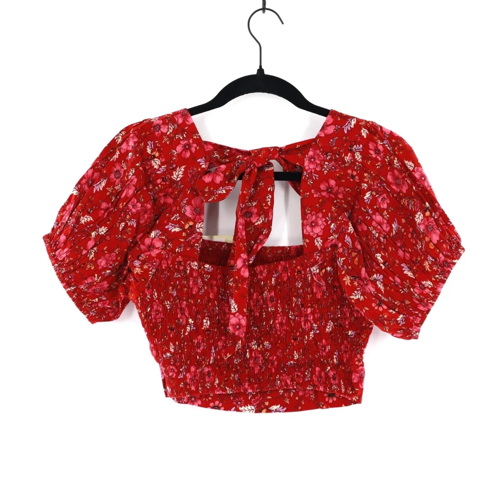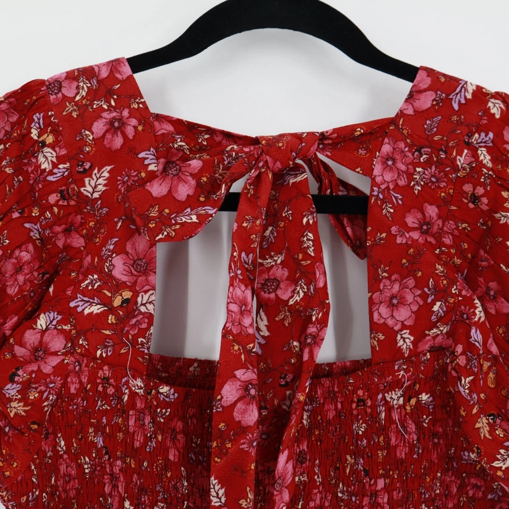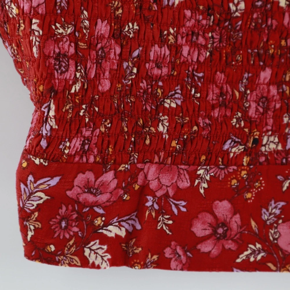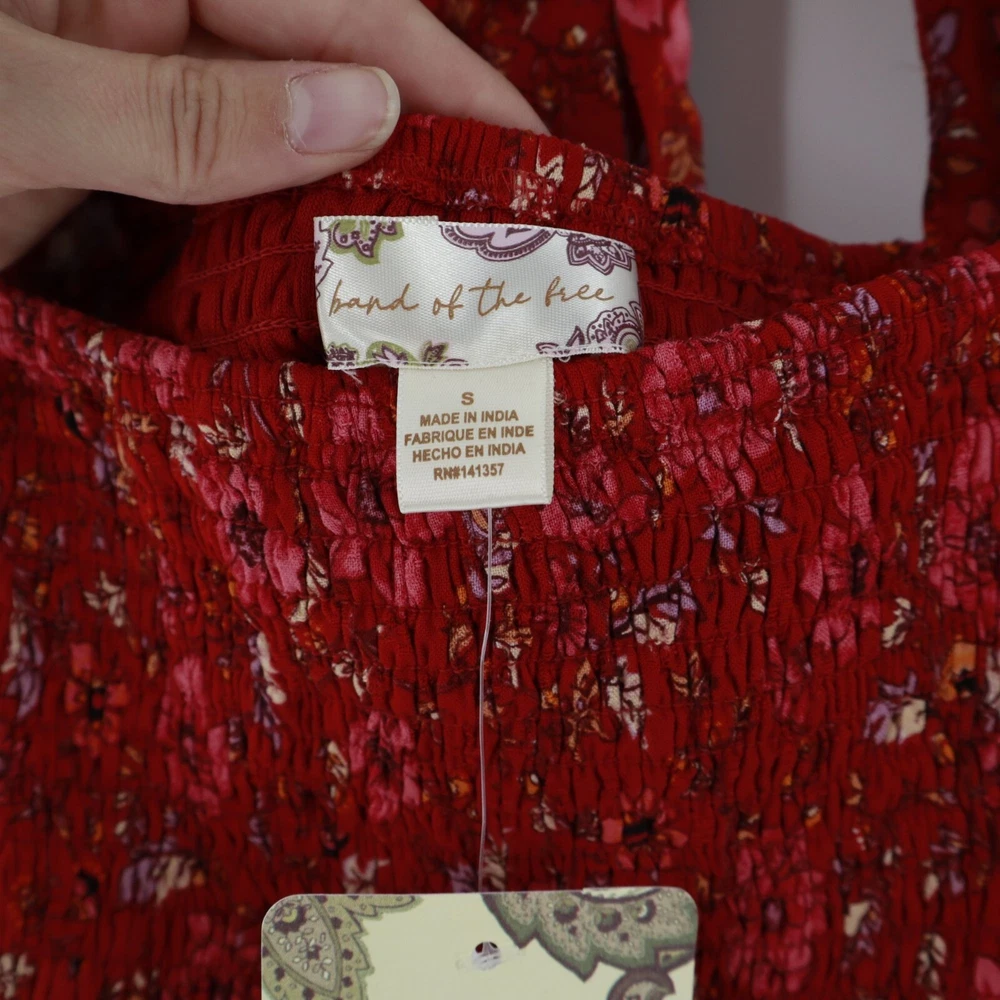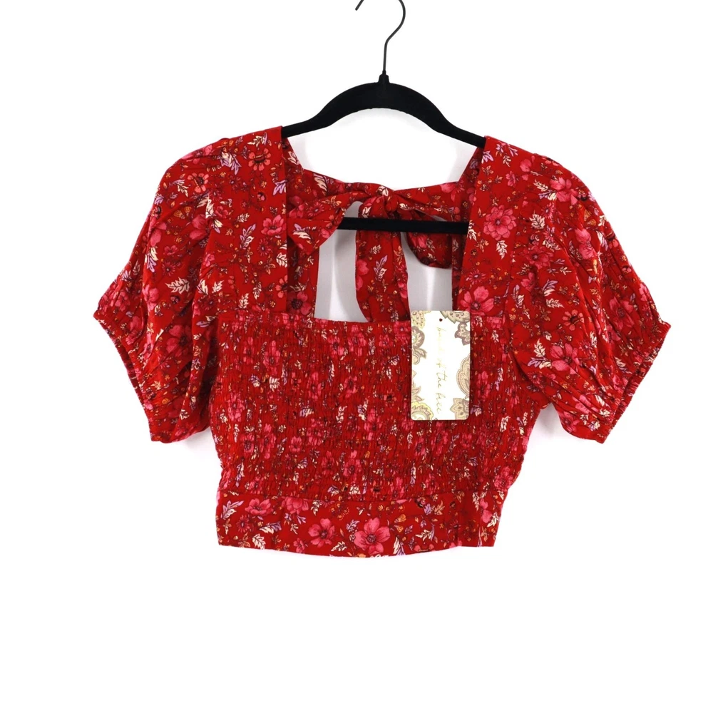Band Of The Free Joelle Crimson Floral Smocked Top Women's Boho Bohemian Gypsy Sweet smocking covers the bodice of our stretchy Joelle top, framed by puff sleeves and finished with a tie back. This top is like your grandma's garden had a party on your shirt. It's got all the florals and puffs to make you feel like a bohemian queen, minus the crown. And if you get tired of compliments, just tie the bow tighter to block out the noise. • Smocked bodice • Elastic cuffs on sleeve • 100% Viscose • Hand wash, line dry • Puff sleeves for added flair • Back tie closure • Lightweight and breathable B.O.G Collective Band of Gypsies Features: • bohemian, boho, cottagecore, grannycore, flowy, hippie, paisley, festival, garden party, gypsy, witchy Condition: New With Tags
