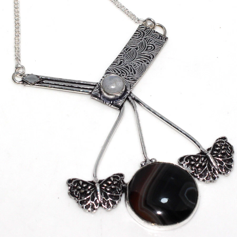 Color: AS SEEN IN PICTURE Length: 19 Metal Purity: Unknown Main Stone: Banded Black Onyx UPC: does not apply Main Stone Color: As Seen in Picture Main Stone Shape: AS Seen in Picture Number of Gemstones: AS Seen in Picture Main Stone Creation: Natural Country of Origin: India Handmade: YES Necklace Size: 19 gtin13: does not apply Theme: Ethnic Features: Silver Plated Cut Grade: Excellent Antique: NO Era: Undated Personalize: No Country/Region of Manufacture: India Base Metal: Copper Metal: Copper Alloy Occasion: Wedding Gifts, Valentine's Gift, Mother's Day, Christmas Secondary Stone: Rainbow Moonstone Sizable: Yes Necklace Length: 19 Brand: HANDMADE Pendant Shape: AS Seen in Picture Band Width: Band Width MPN: RJ28982 Material: Stone Size: 19 Customized: No Type: Necklace Style: New Setting Style: collet setting Wholesale: As your Request Main Stone Treatment: Not Enhanced