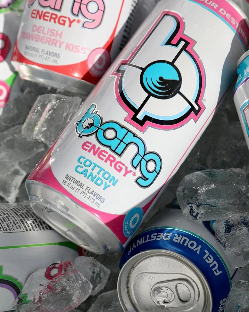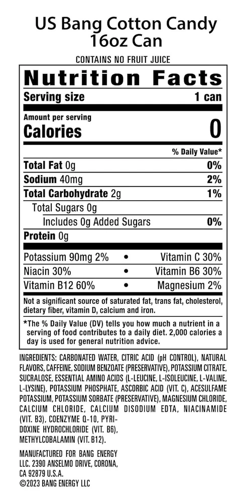 Ingredients carbonated water, natural flavors, citric acid, phosphoric acid, caffeine, sodium benzoate (preserves freshness), potassium citrate monohydrate, EAAs (L-leucine, L-isoleucine, L-valine, L-lysine, L-threonine, L-phenylanine, L-histidine, L-methionine, L-tryptophan), sucralose, potassium phosphate dibasic, vitamin C (ascorbic acid), potassium sorbate (preserves freshness), magnesium chloride, calcium chloride, calcium disodium EDTA, vitamin B3 (niacinamide), vitamin B6 (pyridoxine hydrochloride), and vitamin B12 (mthylcobalamin). About this item Brand BANG Item Form Liquid Flavor Cotton Candy Number of Items 12 Package Information Can 300 MG OF CAFFEINE: Bang Energy drinks contain enough caffeine to power you through any activity of the day. Stay energized for longer without the dreaded crash. ZERO-SUGAR ENERGY DRINK: NO sugar necessary Just great-tasting, sustained energy. ULTRA CoQ10 and EAAs (Essential Amino Acids) GLUTEN-FREE AND VEGAN-FRIENDLY: Bang Energy drinks are gluten-free and vegan-friendly, so they are perfect for any lifestyle or diet. ZERO CARBS, ZERO ARTIFICIAL COLORS and ZERO CALORIES. Product Description Only the reformulated Bang Energy drinks have been tested and verified to be gluten-free and vegan-friendly. If you receive cans that have “BCAA Aminos” instead of “EAA Aminos” printed on them, we cannot guarantee that they fall within the gluten-free and vegan-friendly guidelines. Bang is not your typical sugar-filled soda masquerading as an energy drink. Every 16-ounce can of Bang contains 300 milligrams of caffeine, which studies have shown may increase endurance, as well as strength in some cases, along with essential amino acids (EAA Aminos), CoQ10.< What’s more, Bang is sugar-free and has ZERO calories — yet it tastes great, with 21 different flavors to choose from and counting!