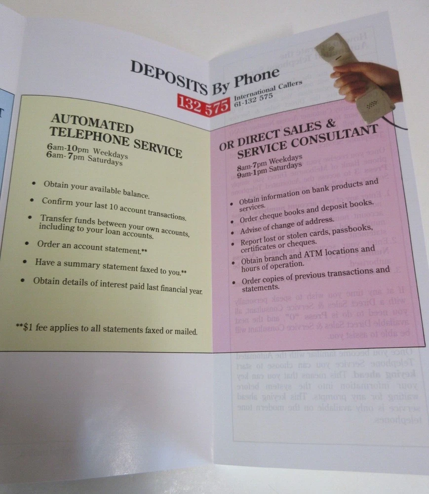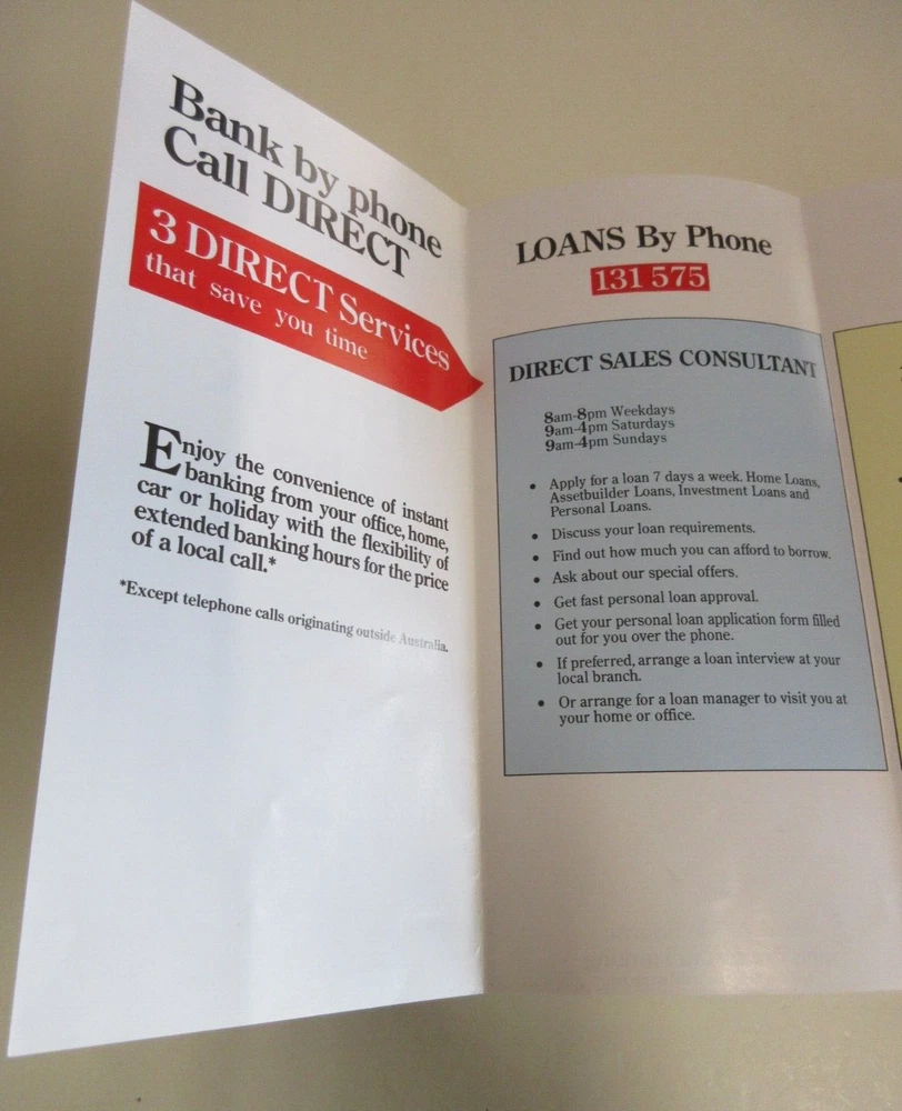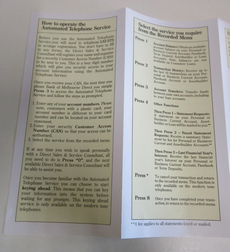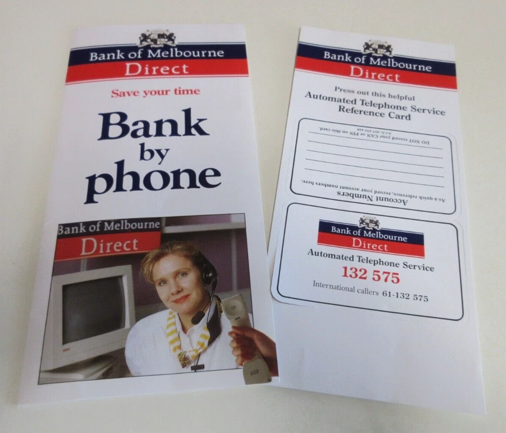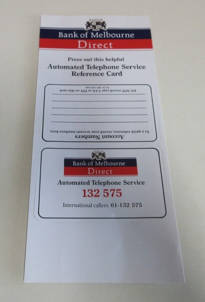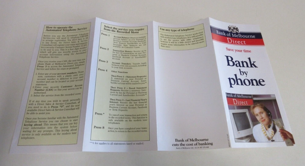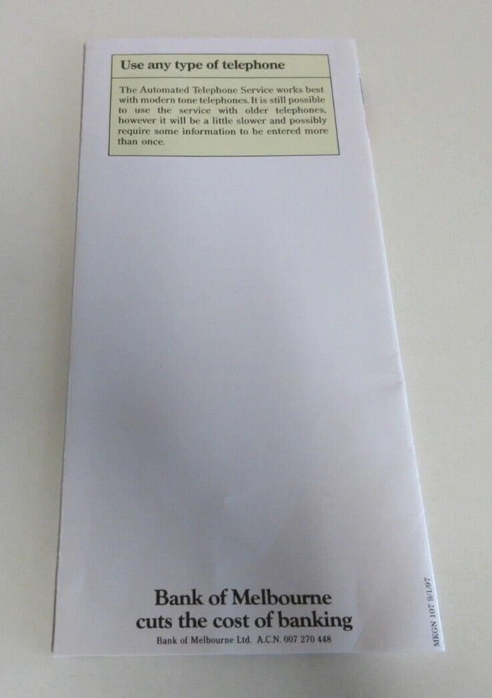Bank of Melbourne phone banking brochure and leaflet from 1997. This 8-panel brochure and leaflet provides information about new ways to bank using the phone. The brochure is 21 cms high and 10 cms wide (as shown in the first photo). The carded leaflet is 20.9 cms high and 9.3 cms wide (as shown in the first photo). I combine postage for multiple items. Questions and offers welcome.