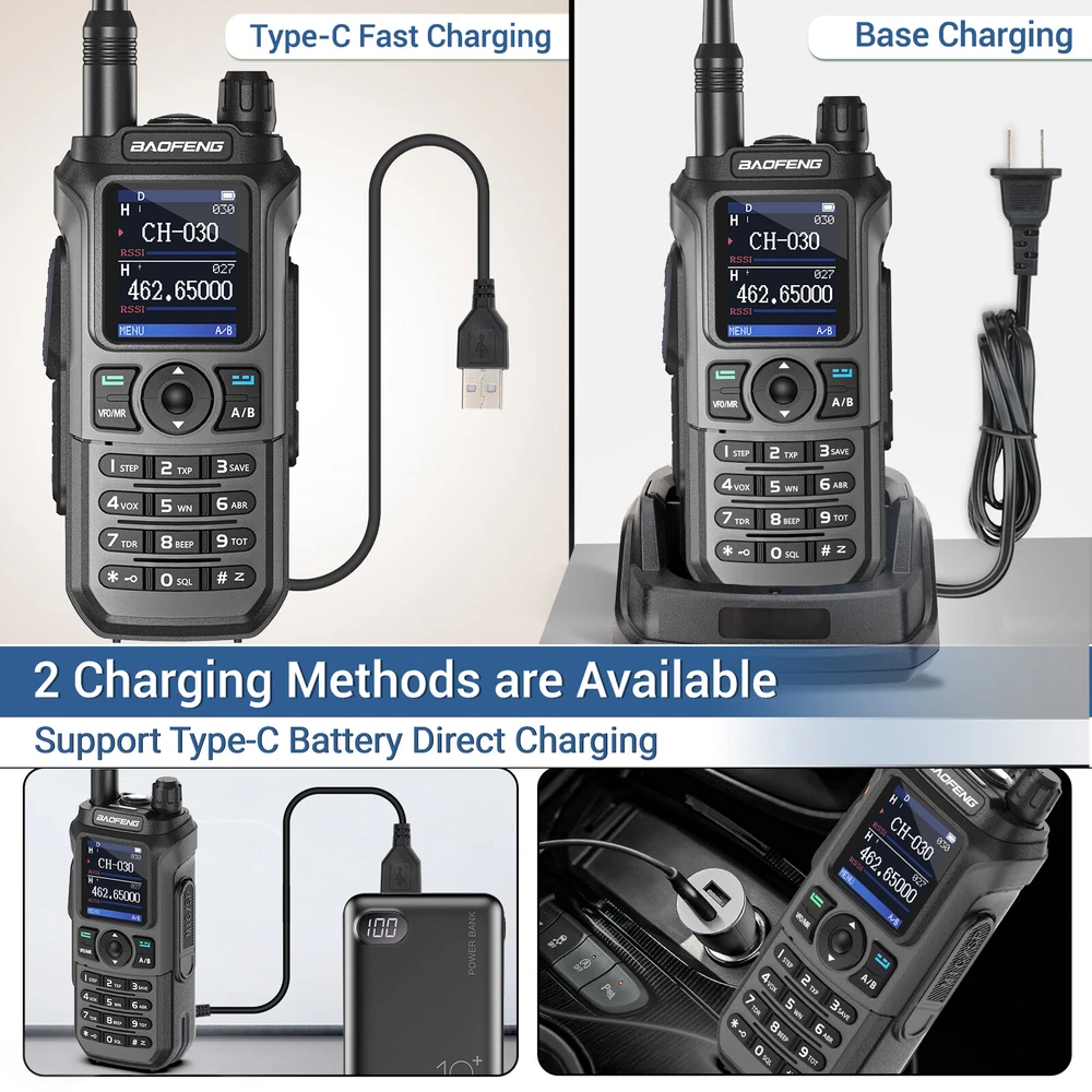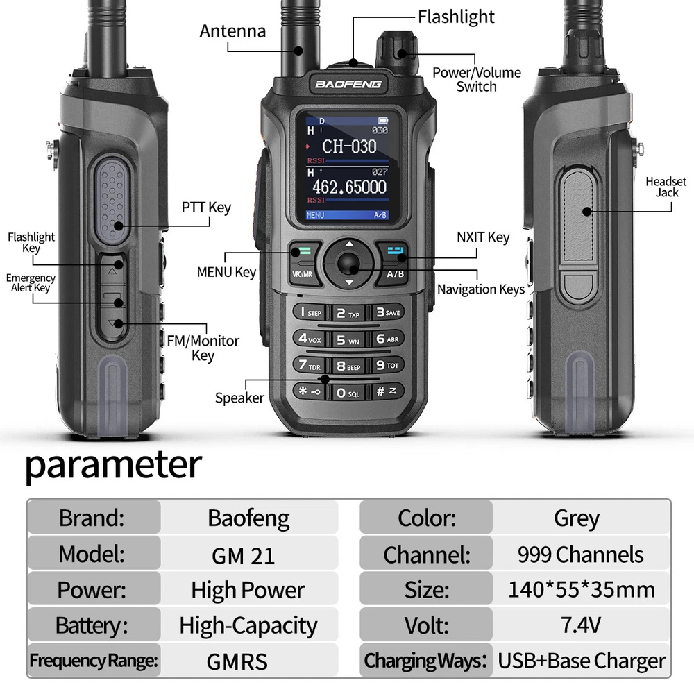 【 Profes sional GMRS Ham Radio 】 The walkie talkie can reach the highest output power level of GMRS handhelds , which will help to get stronger signals and reach longer distances. VOX function can achieve hands-free operation while driving. It is comes with 30 GMRS channels and 10 NOAA weather channels, compatible with FM/UHF/220-260MHz/VHF(only receive), providing comprehensive communication options. FCC ID: 2AJGM-GM21 . 【 Upgraded of UV-5R 】 Up to 999 memory channels,1.77'' large color screen, copy frequency feature, full keyboard, expanded battery capacity from 1500mAh to1800mAh, Support Type-C charger, the enlarged walkie talkie body size, VOX free hand,21CM high gain antenna for improved reception. 【 NOAA weather receiver & scan 】 It can scan and receive weather reports from channels, predicts severe weather in advance, and can be used as an alternative communication option in the event of a disaster. Use it as your emergency radio, especially if your phone is dead or has no signal . 【 USB-C +Desktop Charger 】 The Type-C charging port is designed on the back of the battery. Two charging methods making convenient for you to charge anytime and anywhere. When you go out, you can charge your walkie talkie on the car, power bank, laptop, wall or any USB interface device, no longer worrying about battery life issues. 【 Copy Frequency 】 Easily decipher the frequency of another ham walkie talkie without the need for computer programming. The function is even more perfect, Suitable for various scenarios. 【 Package Included 】 1XRadio; 1XBattery; 1X 21CM Antenna; 1XHeadset; 1XUSB-C Charging Cable; 1X Base Charger; 1XBelt; 1XLanyard; 1XManual .1X771 Antenna ( Kindly Tips : If you need programming software you can contact our after-sales service, we will actively cooperate with you )