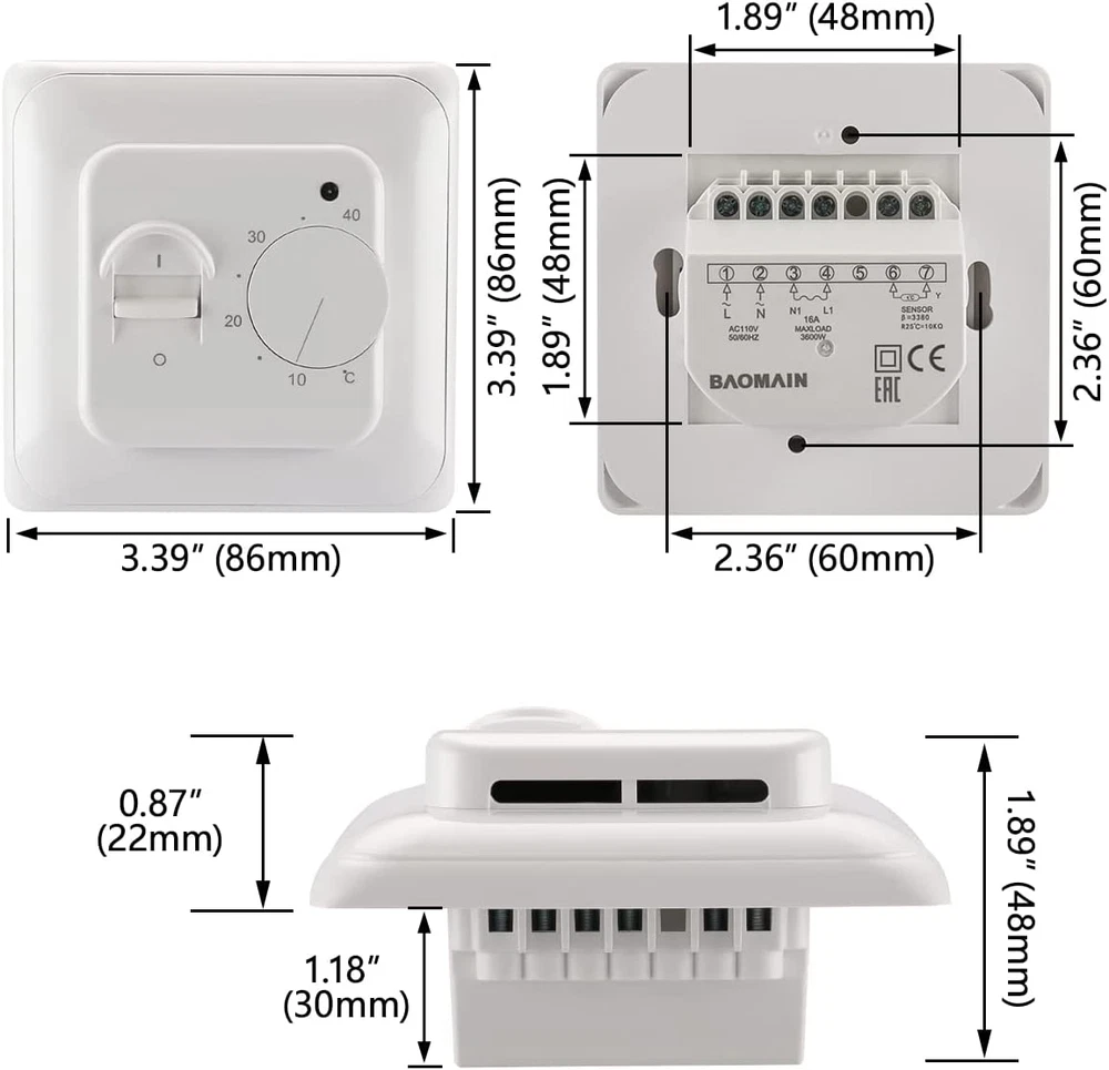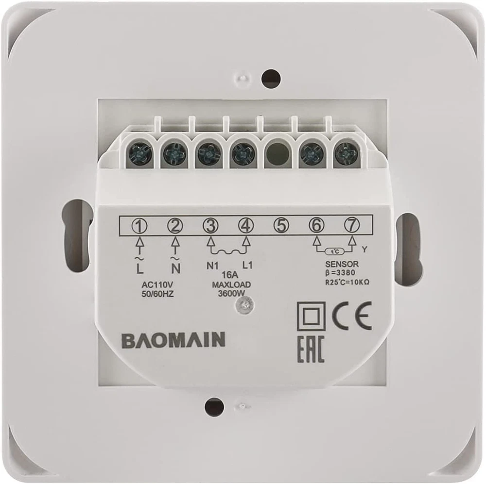 Store New Arrivals Add to Favorite View Feedback Contact Baomain Home Nonprogrammable Thermostats, Radiant Floor Heating Temperature Description Item model number BM-J01-C Style button Power Source Electric Country of Origin China Temperature Control Type Manual Controller Type Mechanical knob Control Type Button Control Brand Baomain Material anti-flammable PC Model Name BM-J01-C Finish Type Brushed Specific Uses For Product Commercial buildings, Residential buildings, Light industrial buildings, Mild weather conditions Manufacturer Baomain Electric Control Method Touch Item Weight 8.4 ounces Special Feature Temperature Display Display Type Manual Mounting Type Floor Mount Color White Wattage 2 watts Shape Square Voltage 120 Volts Included Components Floor temperature sensor with 3m cable Product Dimensions 1.69"D x 3.39"W x 1.69"H Backlight Yes Ambient temperature display accuracy: ±0.1°C Temperature control accuracy: ±0.5°C Power Supply Voltage: 115 VAC ±10% 50/60Hz Load current:16 Amp; Power Comsumption: <2W Temperature Unit: Degrees Celsius Levels of Protection: IP20 Features: For the control of warm-water (floor) heating systems and direct electric heating systems used in Commercial buildings, Residential buildings, Light industrial building. Ideal for intermittent use. These thermostats work particularly well in mild weather where heating is often not fully required. Specifications: Temperature control range: 5°C-35°C(can be modified to 5°C-95°C, the upper limit is 35℃-60℃ adjustable) Installation Method: conceal installation Housing Material: anti-flammable PC Dimensions: 86 mm x 90 mm x 43mm Installation hole distance: 60mm Weight: 248g Levels of Protection: IP20 Floor temperature sensor with 3m cable included Maximum switch rating of 16Amps LED to indicate when heating is on ABOUT US We offer the best prices around on high quality products. Our E-store includes media such as books, movies, music and games while offering electronics, toys, sporting apparel, clothing, tools, general home, garden items and more. SHIPPING We are always working hard to ensure your package arrives as soon as possible. Please understand that some factors like weather, high postal traffic, and the performance of shipping companies are outside of our control. We offer free shipping to the lower 48 states and ship within 2 business days of payment, usually sooner. We do not accept P.O. Boxes. Please provide a physical address. RETURNS We offer a 30-Day Return Policy on items which you are not completely satisfied with. You have the option for a full-refund or an exchange of the item. No returns are available on items shipped outside of the USA. PAYMENT We accept PayPal. CONTACT US This page content is yet to come Please ad us to your favorite seller and visit again later Thank You CUSTOMER SATISFACTION We try our very best to make sure every customer is completely satisfied. If there's a problem, message us! We're happy to help.