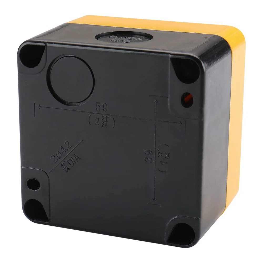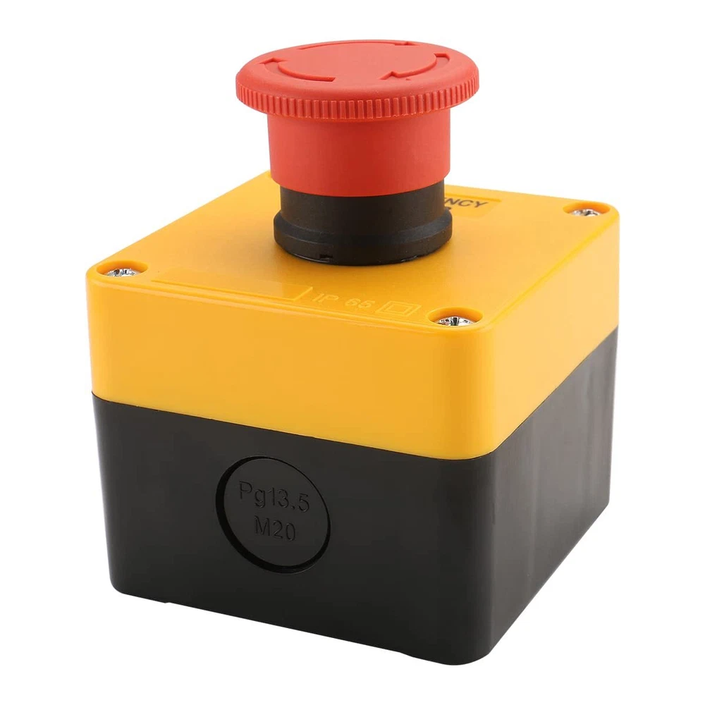 Product name: Emergency stop push button switch with box; Ith: 10A, Ui: 660V, Contact Type: 1NO 1NC Button Diameter : 40mm/1.6" ; Mount Hole Diameter : 22mm / 7/8"(0.87") Dimensions: 2.8" x 2.8" x 3.43"/71mm x 71mm x 87mm (Height with pushbutton switch) Package content : 1 x Emergency Stop Push Button Switch
