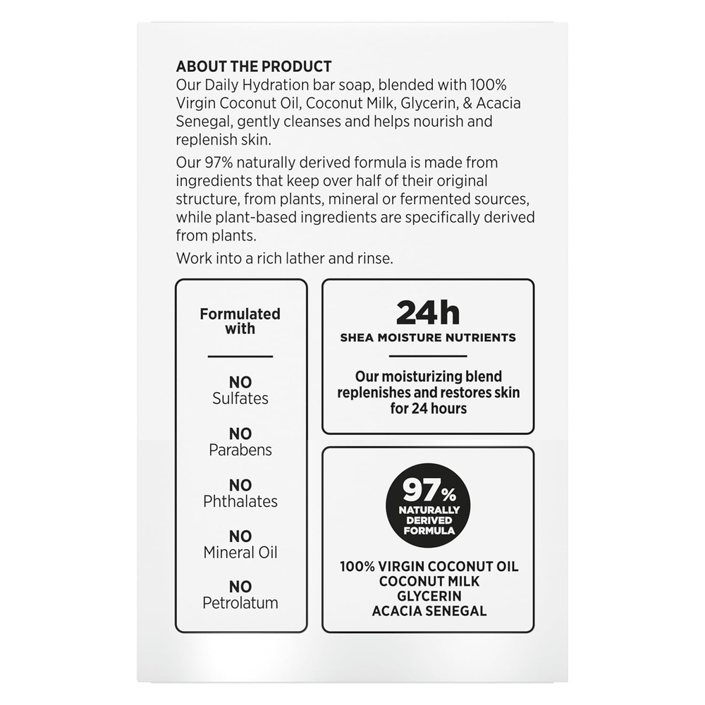 Store New Arrivals Add to Favorite View Feedback Contact Bar Soap Virgin Coconut Oil 4 Count Nourish and Replenish Skin Daily Hydrating Bar Soap with 24H Shea Moisture Nutrients for Healthy, Glowing Skin 8 Oz Description Item dimensions L x W x H 8.62 x 12.75 x 2.5 inches Product Dimensions 8.62 x 12.75 x 2.5 inches; 2 Pounds Country of Origin USA Item Weight 32 Ounces Age Range (Description) Adult Scent Coconut SheaMoisture's 100% Virgin Coconut Oil Daily Hydration Bar soap, designed for melanin-rich skin, replenishes and restores skin for 24 hours. Infused with 100% Virgin Coconut Oil, Coconut Milk, Glycerin & Acacia Senegal, this bar soap gently cleanses and helps nourish and replenish skin. Made with fair trade shea butter and 92% naturally derived ingredients, this bar soap is free from sulfates, parabens, phthalates, mineral oil, and petrolatum. Upon use, skin feels calm, smooth, and visibly moisturized. For best results, use in combination with other products from SheaMoisture's 100% Virgin Coconut Oil Collection. SheaMoisture is committed to serving the Black community through strategic investment and community give back. With every purchase, you're helping to fund investments that support Black-owned businesses. Our new 100% Virgin Coconut Oil Daily Hydration Bar soap is designed specifically for melanin-rich skin. Infused with 100% Virgin Coconut Oil, Coconut Milk, Glycerin & Acacia Senegal, this bar soap works to nourish and replenish skin, leaving it feeling soft, smooth, and visibly moisturized for 24 hours. Our moisturizing Bar soap is formulated with fair trade Shea Butter. Through our proprietary Shea Emulsion technology, we were able to break down Shea Butter into thousands of droplets that provide even, smooth coverage across the skin. This bar soap is 92% naturally derived and free from sulfates, parabens, phthalates, mineral oil, and petrolatum. For best results, use this bar soap in combination with other products from SheaMoisture's 100% Virgin Coconut Oil Collection. ABOUT US We offer the best prices around on high quality products. Our E-store includes media such as books, movies, music and games while offering electronics, toys, sporting apparel, clothing, tools, general home, garden items and more. SHIPPING We are always working hard to ensure your package arrives as soon as possible. Please understand that some factors like weather, high postal traffic, and the performance of shipping companies are outside of our control. We offer free shipping to the lower 48 states and ship within 2 business days of payment, usually sooner. We do not accept P.O. Boxes. Please provide a physical address. RETURNS We offer a 30-Day Return Policy on items which you are not completely satisfied with. You have the option for a full-refund or an exchange of the item. No returns are available on items shipped outside of the USA. PAYMENT We accept PayPal. CONTACT US This page content is yet to come Please ad us to your favorite seller and visit again later Thank You CUSTOMER SATISFACTION We try our very best to make sure every customer is completely satisfied. If there's a problem, message us! We're happy to help.