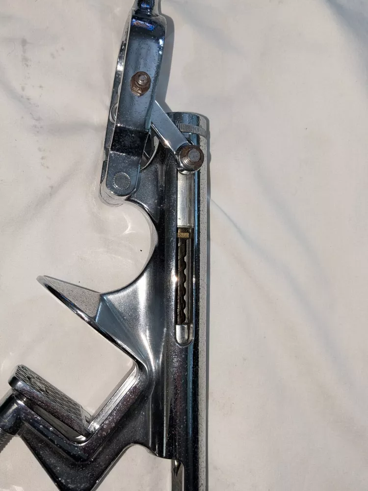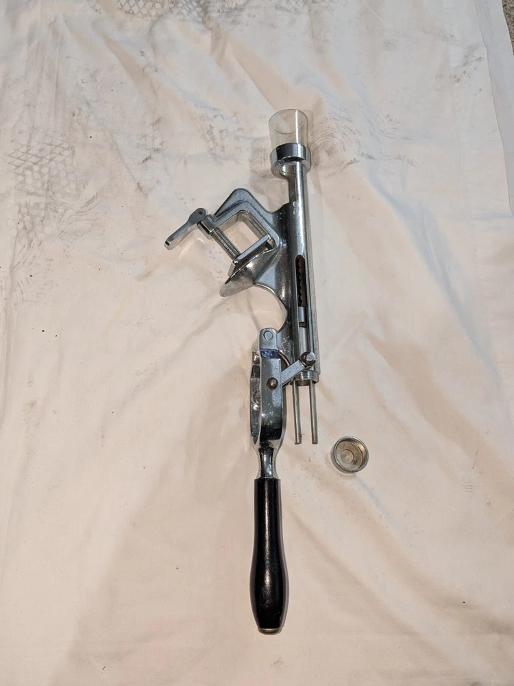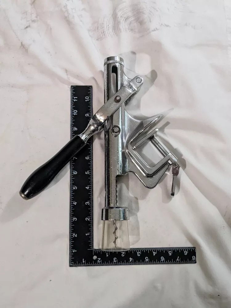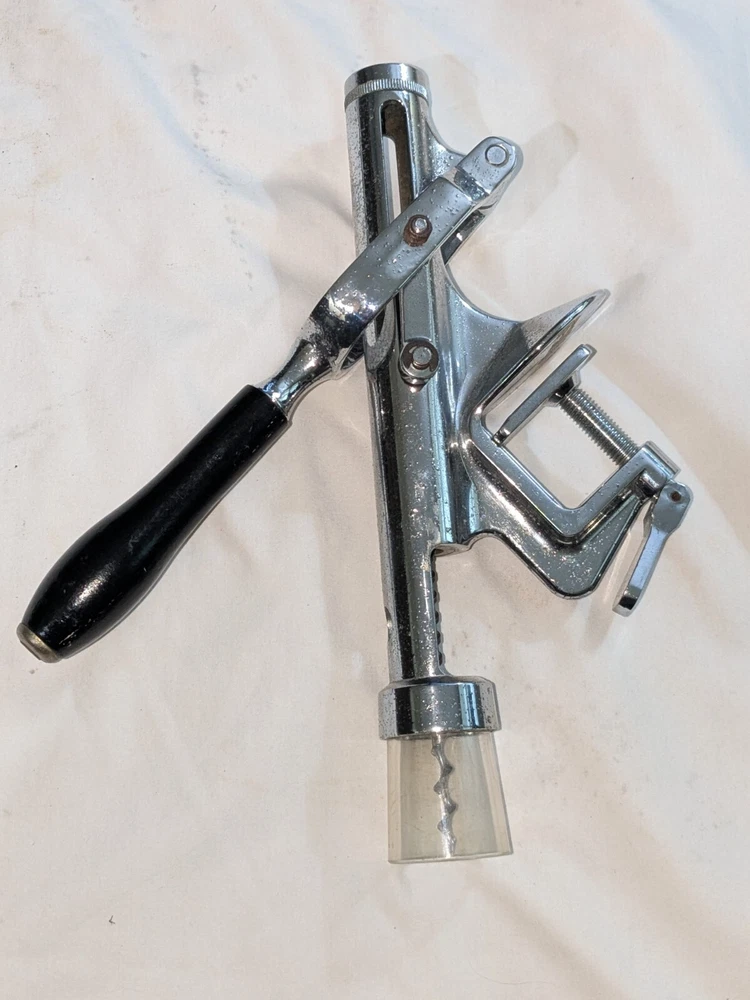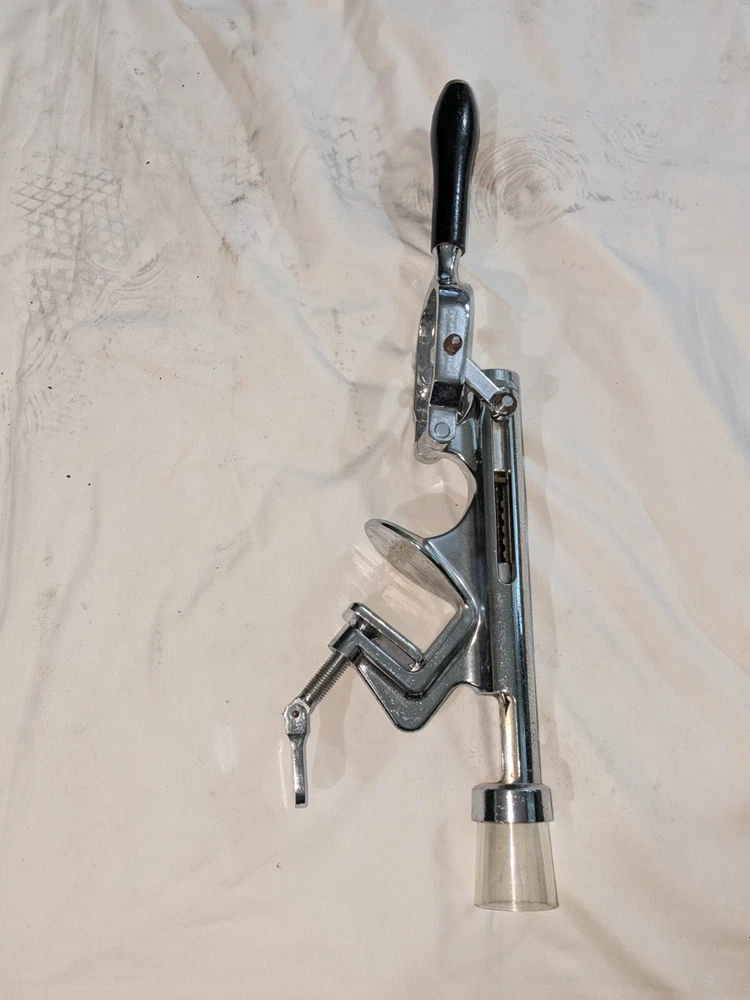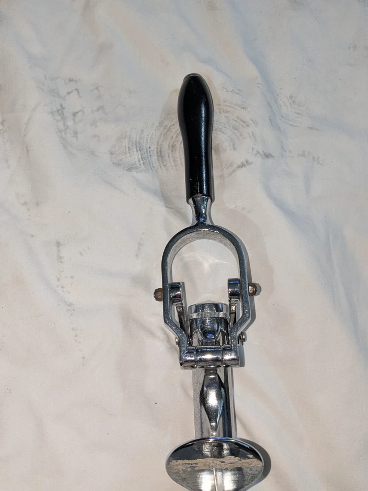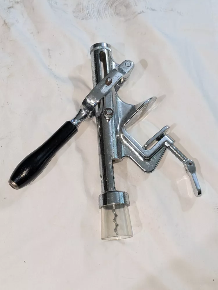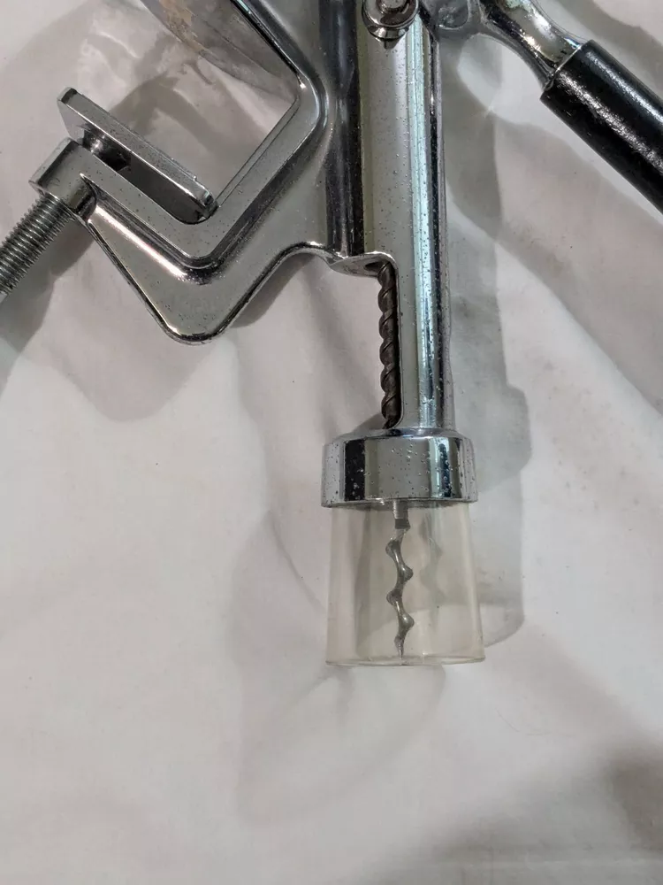 The photos show everything. Not terribly old, possibly vintage? This counter mount corkscrew is a great addition to any home or commercial bar. I am not sure what particular metal it is made of, possibly chrome-plated brass? I do not know , but I do know that a magnet does not attract it . You can see some light pitting or some type of flaw in the chrome plating, not terribly visible, but you definitely can see it and feel it. It has a nice black wood handle. It weighs 5 lbs., approximately . It works just fine. Not much more to add that the photos do not show. They are the description and they show the condition. Please use the zoom feature and ask any questions you may have. This will ship using UPS, FedEx or USPS, whichever I select at time of shipping.