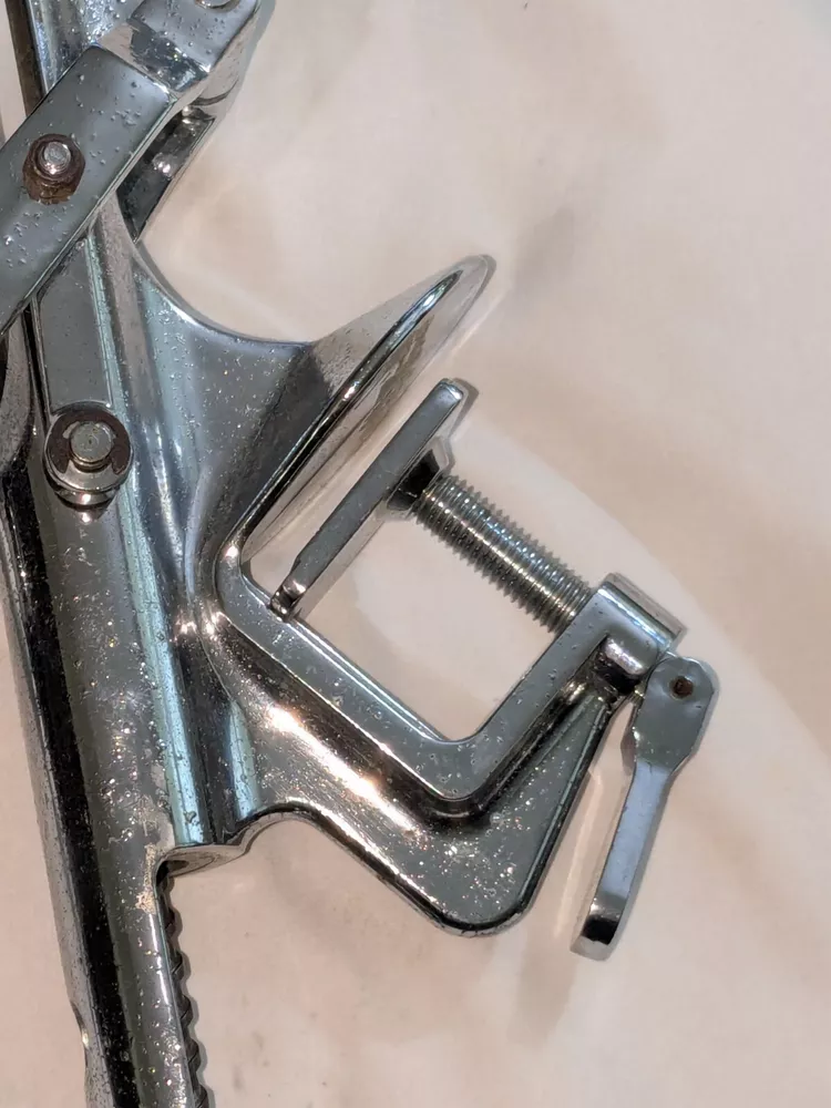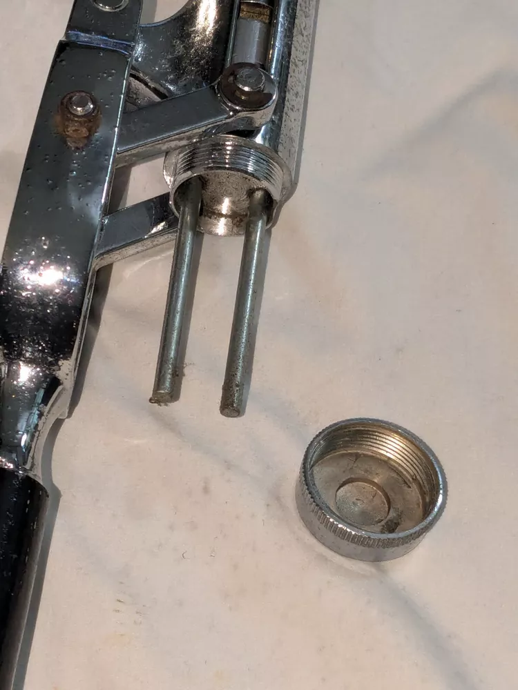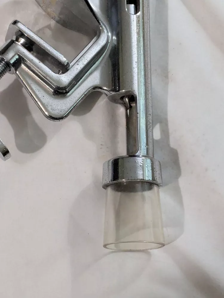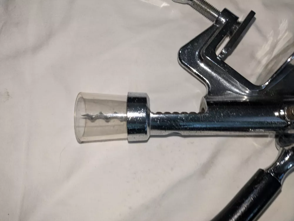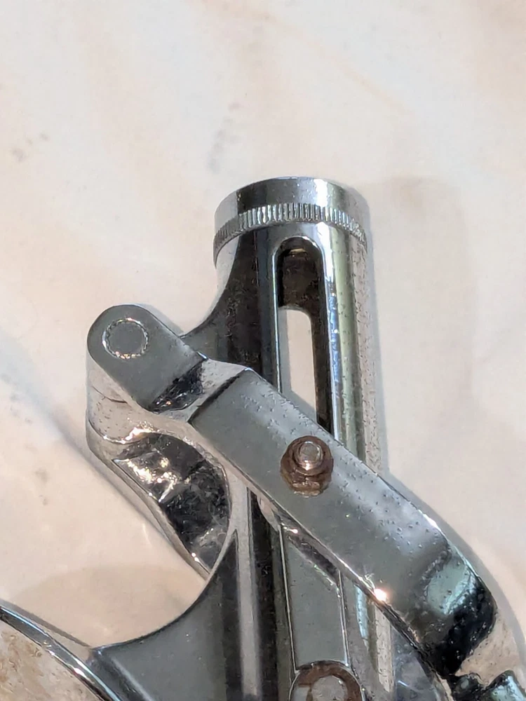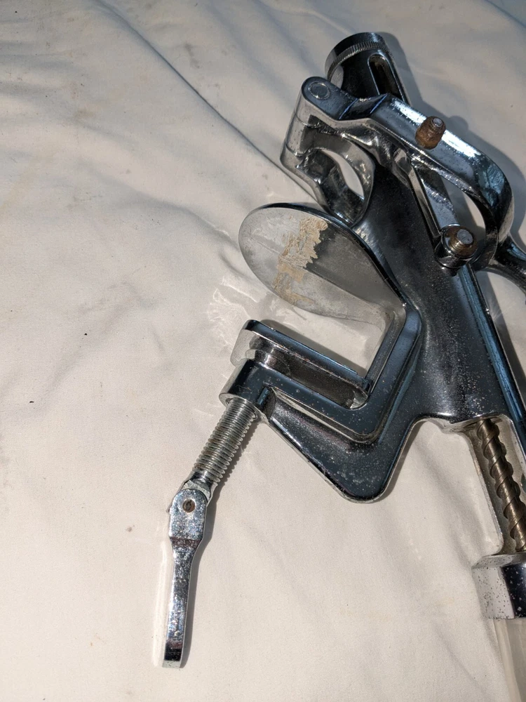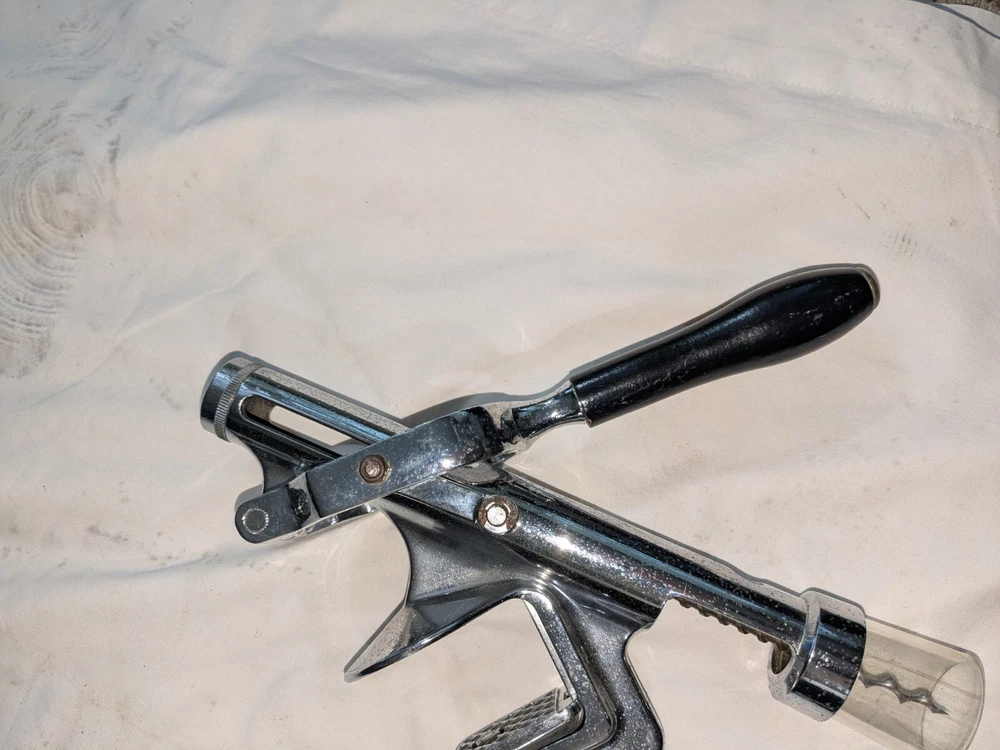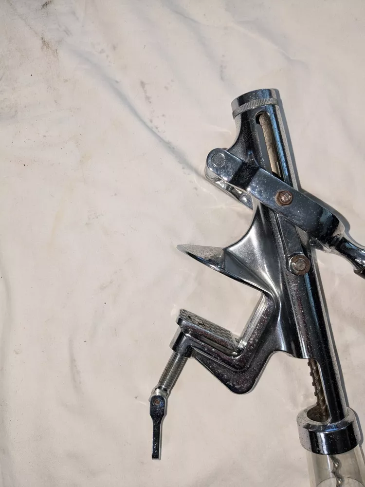 The photos show everything. Not terribly old, possibly vintage? This counter mount corkscrew is a great addition to any home or commercial bar. I am not sure what particular metal it is made of, possibly chrome-plated brass? I do not know , but I do know that a magnet does not attract it . You can see some light pitting or some type of flaw in the chrome plating, not terribly visible, but you definitely can see it and feel it. It has a nice black wood handle. It weighs 5 lbs., approximately . It works just fine. Not much more to add that the photos do not show. They are the description and they show the condition. Please use the zoom feature and ask any questions you may have. This will ship using UPS, FedEx or USPS, whichever I select at time of shipping.