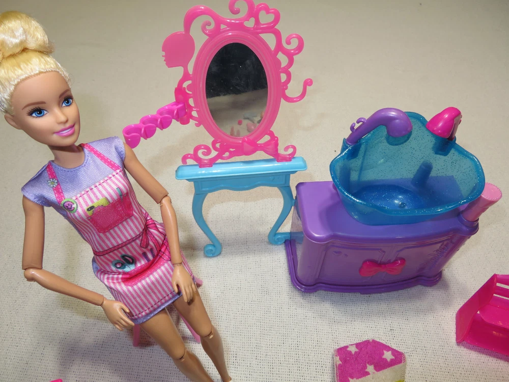 This Barbie doll playset is a one-of-a-kind Salon Lot from 2013. It includes 29 pieces and features a blonde, 12-inch straight-hairstyle doll with blue eyes and light complexion. The doll is part of the Career series and comes with various accessories such as hard plastic, cloth, plastic, rubber, and fabric. This set is perfect for all occasions and is an original, licensed reproduction from Mattel. It is not handmade and was manufactured in China. The Barbie doll playset is not vintage and was not signed. It is suitable for children aged 5-7 years and comes without packaging.