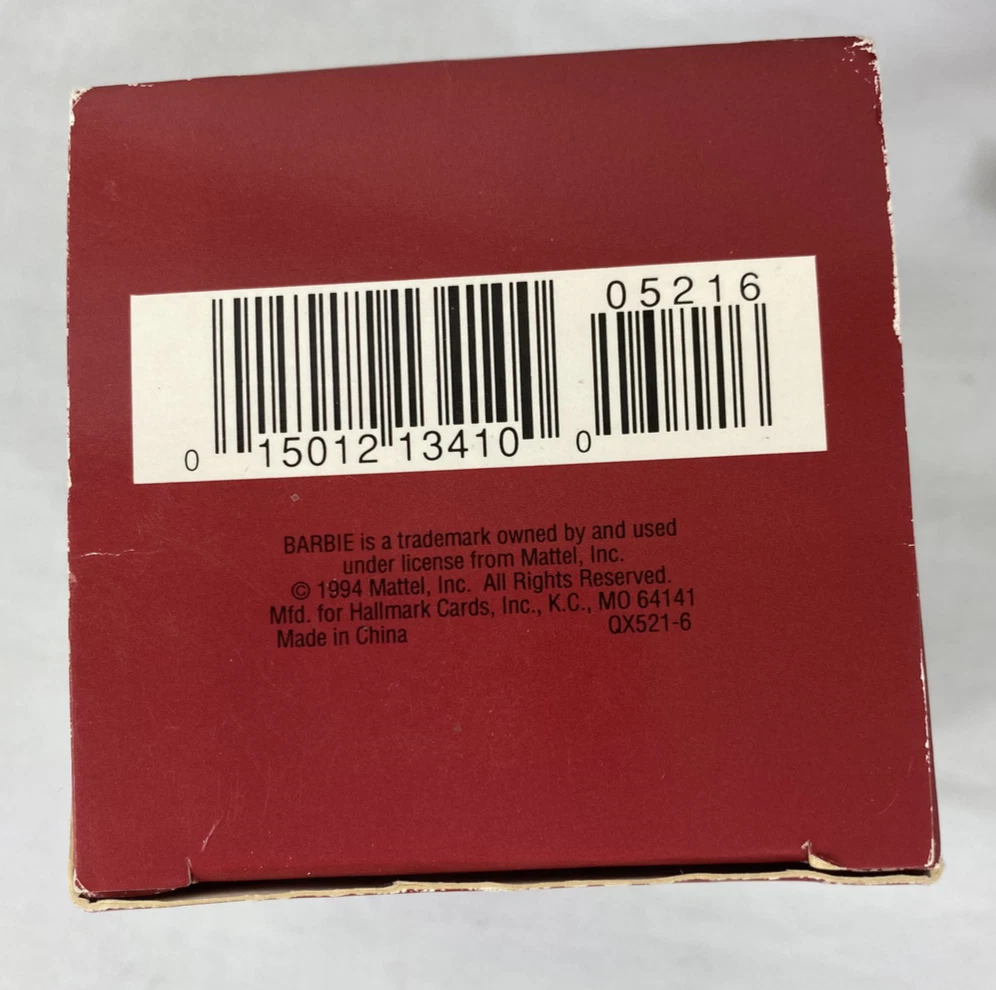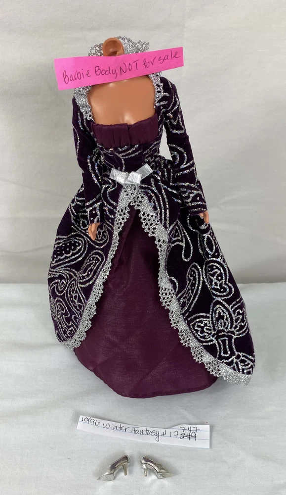 This product is a lot of two Barbie dolls dresses; one in gold and white the other in maroon and silver. Winter Fantasy gowns, along with a 1994 Barbie Hallmark Keepsake Holiday Ornament are complementary to any collection. The dresses are compatible with a 12in size doll/Barbie and are original, licensed reproductions from the Barbie Holiday product line. The gowns are made of cloth, the ornament is plastic, and glitter, and the ornament is in its original packaging. The lot is perfect for celebration occasions and features lightweight dolls with a fashion doll type. The dolls are from the 1990-1999 time period and were manufactured in Indonesia. See pictures as they are part of the description. More pictures available. Sold as is.