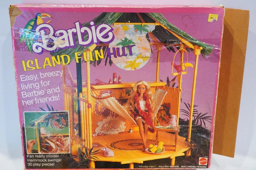 This listing is for a used Vintage Barbie Island Fun Hut Playset #4414. This set is nearly complete, which only a few accessories missing, like the hairbrush, comb, perfume bottles, and hairspray can. Some extra accessories are included. Please note that one of the pegs on the posts is broken, which can be seen in the photos. Also, the green grass cover has become brittle and displaces fibers. It will be plaecd in a separate bag. The original box is included as well. Don't pass up the opportunity to purchase this item for a great price! The item will be packaged securely to prevent damage. Shipping is free to anywhere in the United States. International buyers, please contact me regarding shipping, as prices vary by country. I accept payment by Paypal only. I only accept Paypal from users with CONFIRMED ADDRESSES. The item will be shipped on the same or following day that the payment is received, depending on the time that it is received. Winning bidder must send payment within 5 days. Please feel free to message me if you have any questions.