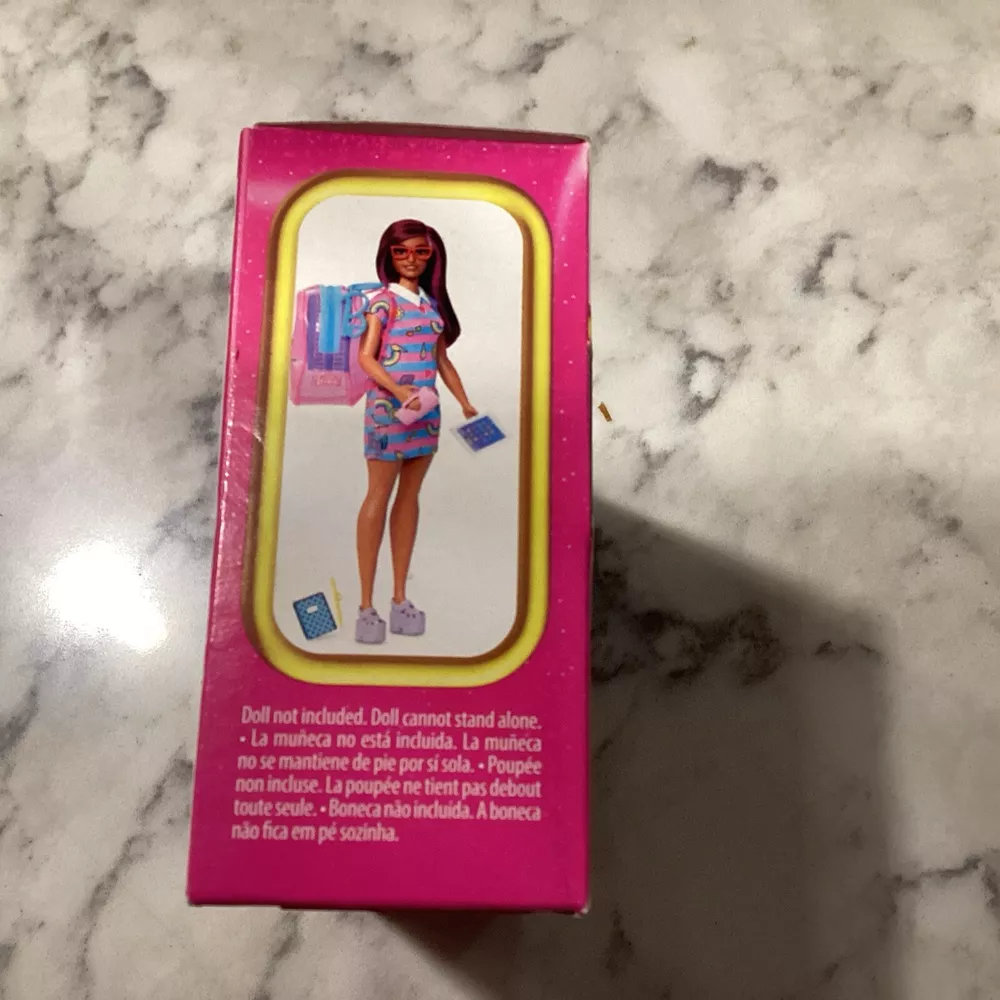 Fast shipping. Add some glam to your Barbie doll's wardrobe with this deluxe bag bundle. The set includes a backpack, dress, sunglasses, and more. Perfect for any occasion, this colorful outfit is sure to make your Barbie stand out from the crowd. Made from high-quality cloth material, this original Mattel product is a must-have for any youth who loves fashion dolls. The Barbie Basics product line ensures that your doll is dressed in style, whether it's for school or a special occasion. Get your hands on this celebrity-themed set today!