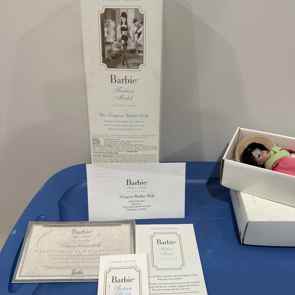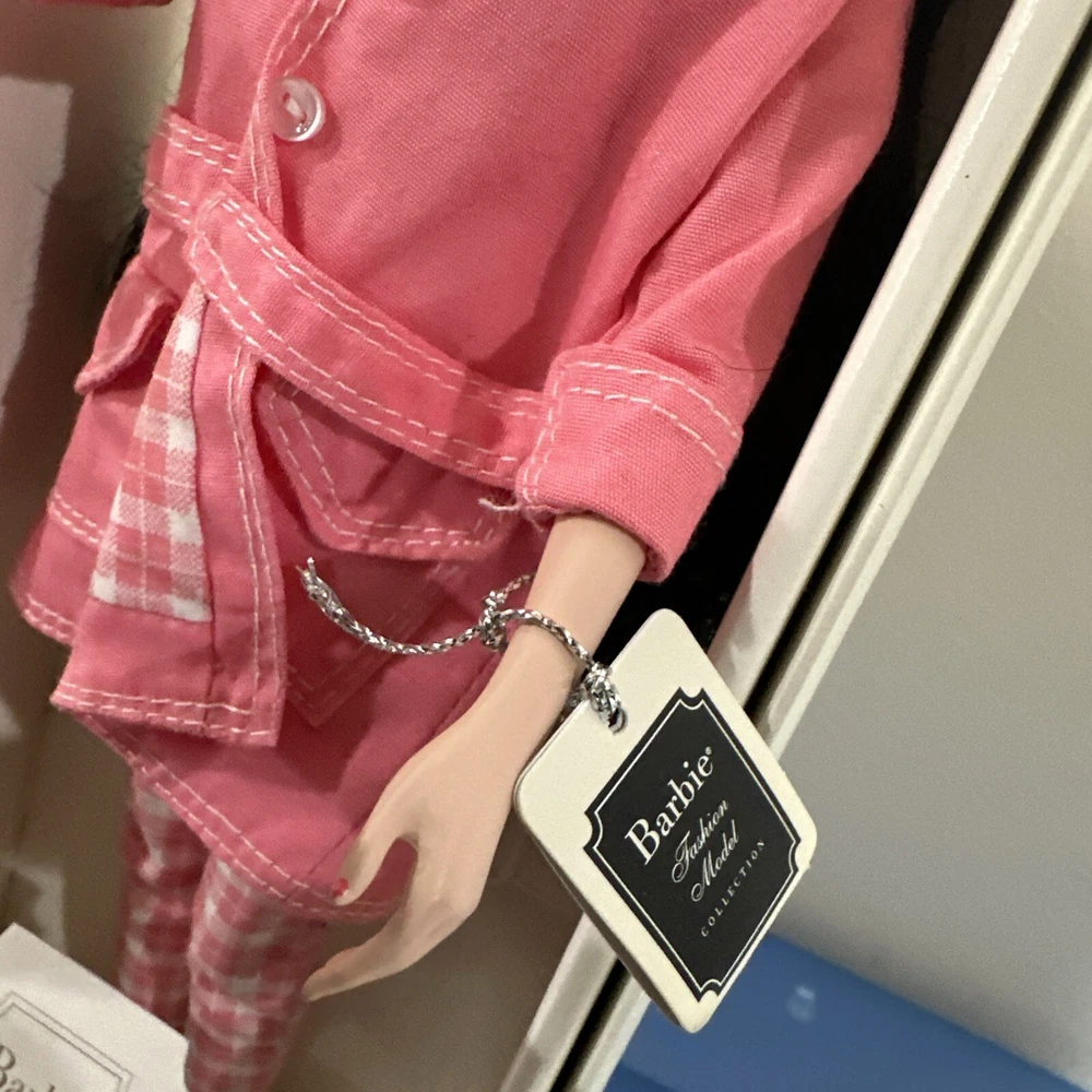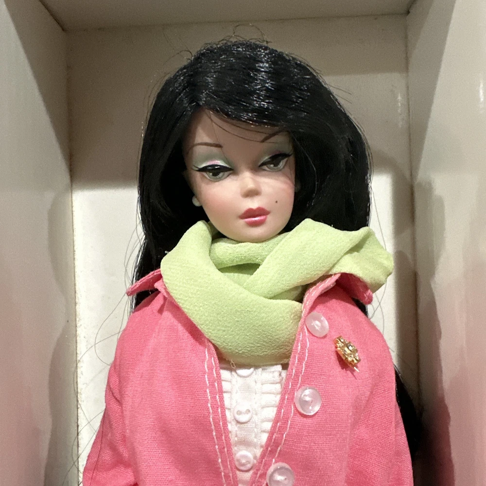 Introducing a rare and limited edition Barbie Silkstone doll with stunning black wavy hair and grey eyes. This doll is part of the Silkstone product line and comes with a unique and rare country-bound outfit. The 11-inch doll is anatomically correct and has a light complexion. It was manufactured in the 2000s and is an original by Mattel. This doll is a must-have for collectors and Barbie enthusiasts alike. Its retired status makes it a rare find and the perfect addition to any collection. The packaging is original with certificates. Don't miss out on the opportunity to own this one-of-a-kind Barbie Silkstone doll. PLEASE NOTE: she doesn’t have her original lingerie . She will come with the outfit shown. Bag its peeling apart( please check pictures) also i think the sunglasses are from other set. Rest like scarf, jewerly and hat correspond to the country bound. Mattel - Barbie - Fashion Model - Country Bound - Outfit Description Fashion Model - Country Bound is an outfit from the Barbie Limited Edition line. The outfit was produced by Mattel in 2002. Release date: 4/1/2002. The outfit was designed by Robert Best. MPN: 55499. UPC: 0 74299 55499 5. The outfit fits Silkstone body. The set includes blouse, coat and pants.