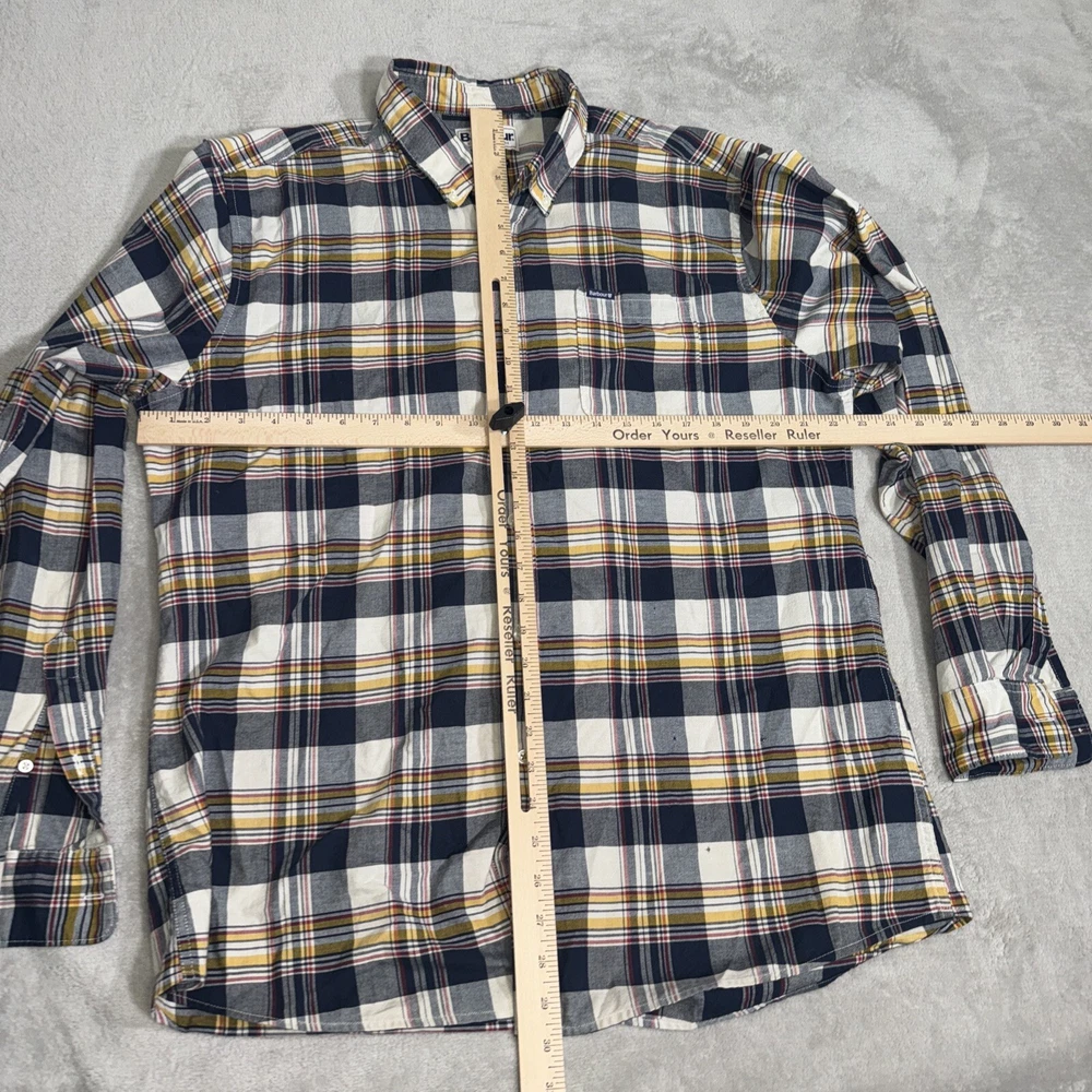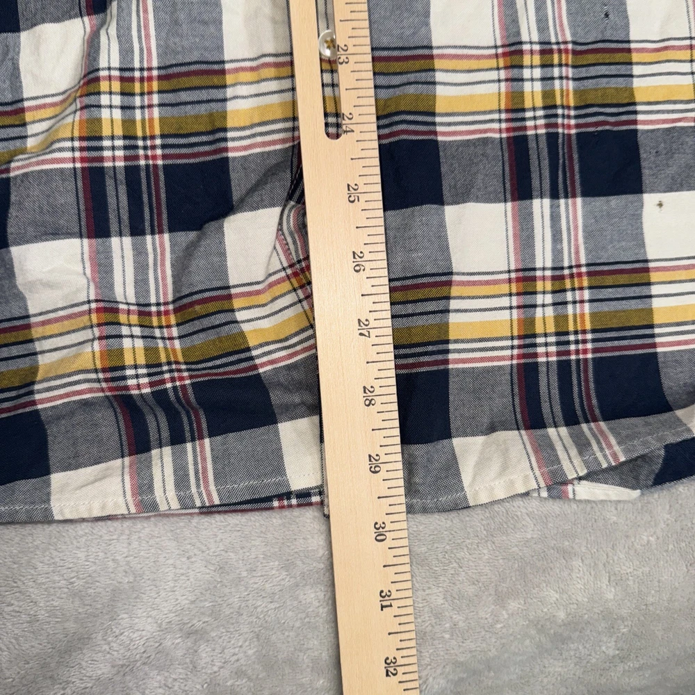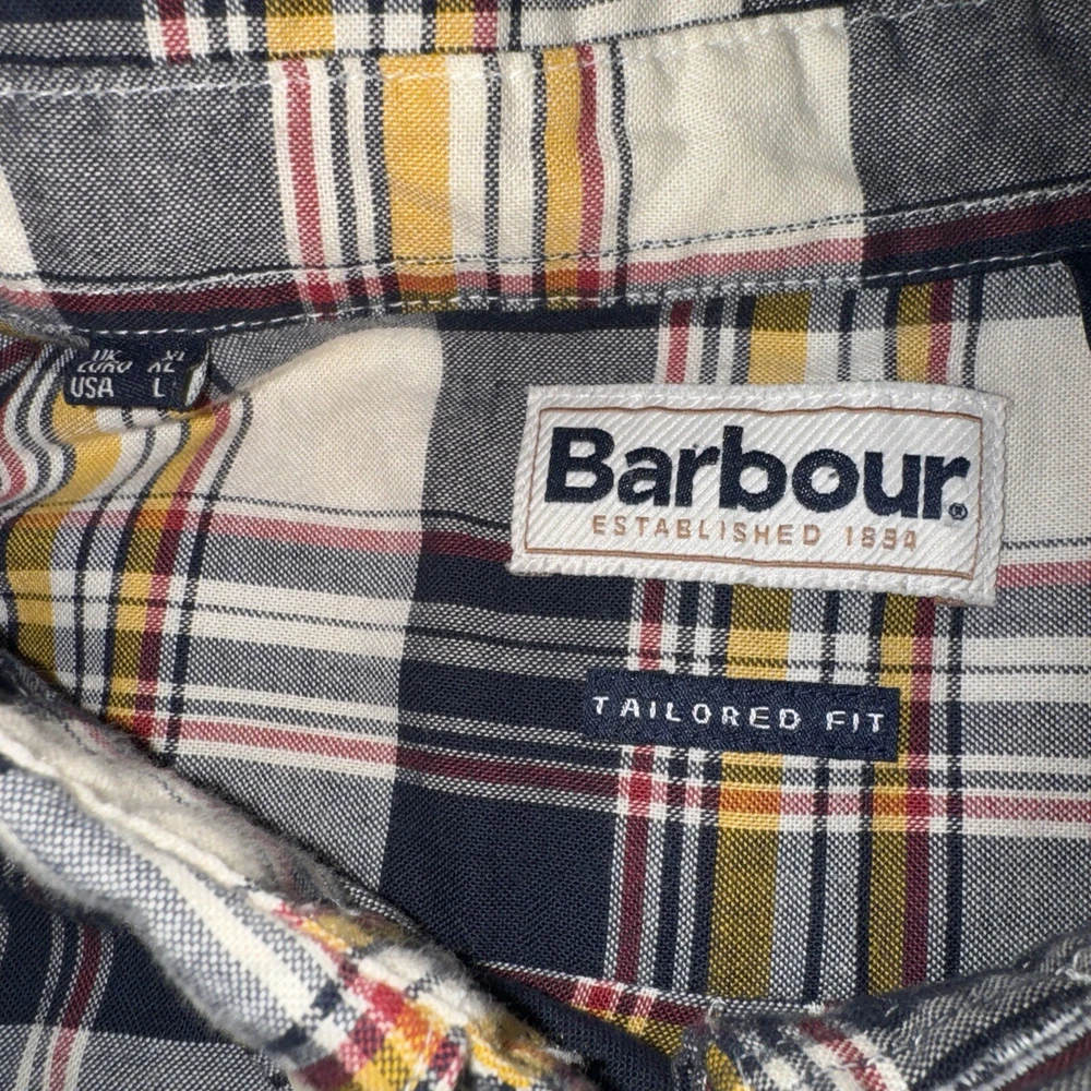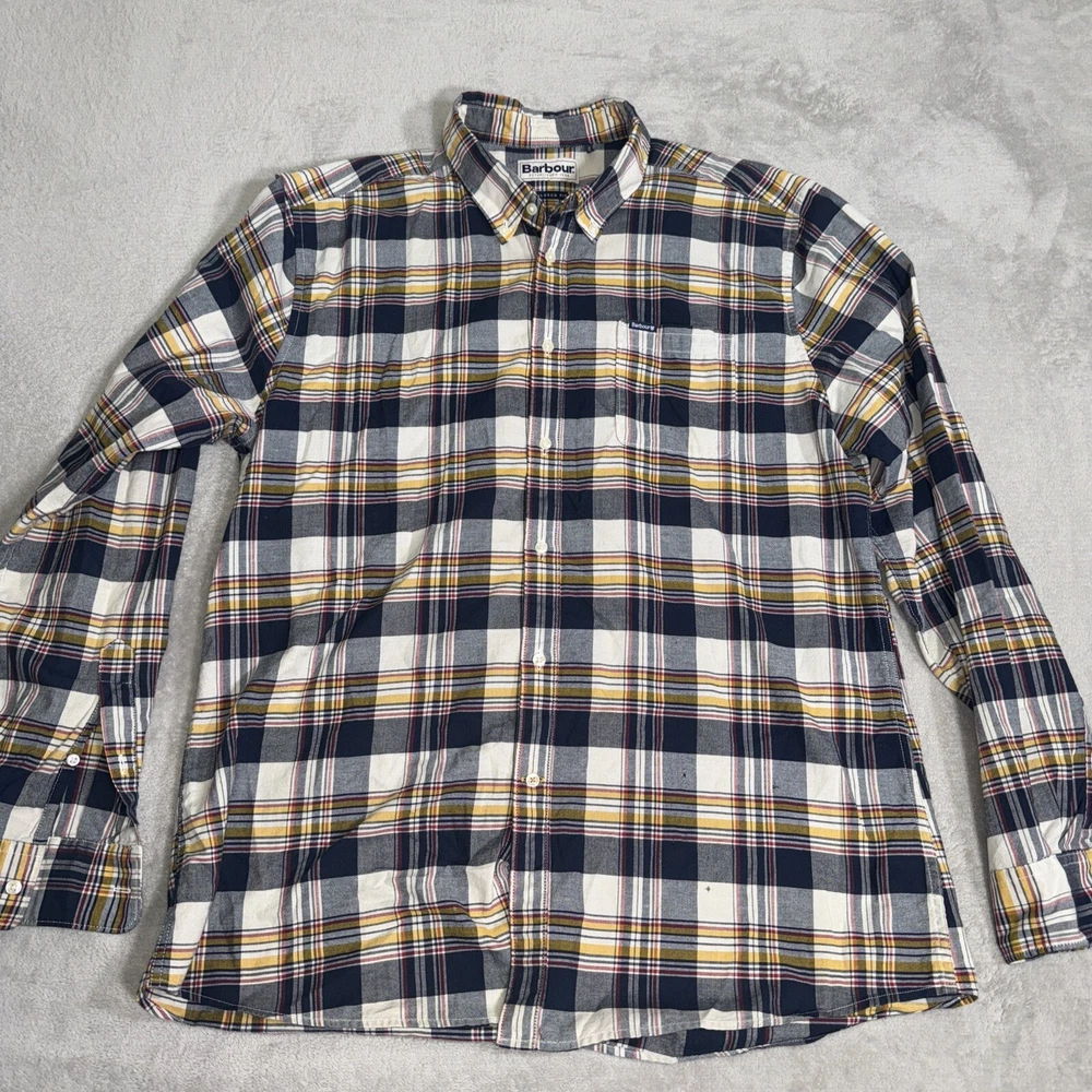 Some small holes on the front. See pics. This Barbour button-up shirt in a mix of plaid colors is a great addition to any men's wardrobe. The tailored fit and 100% cotton material makes it comfortable to wear all day long. Its button-down collar and long sleeves add to its stylish look. The shirt is perfect for casual occasions and can be dressed up or down depending on the occasion. The shirt is in excellent condition and ready to be worn and loved by its new owner.
