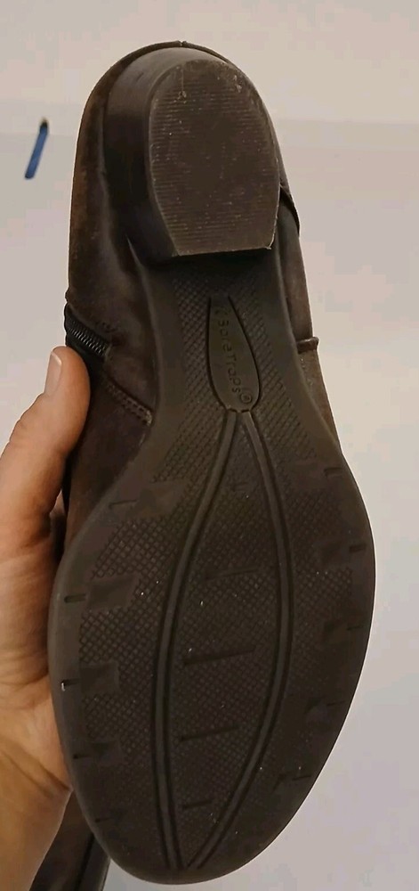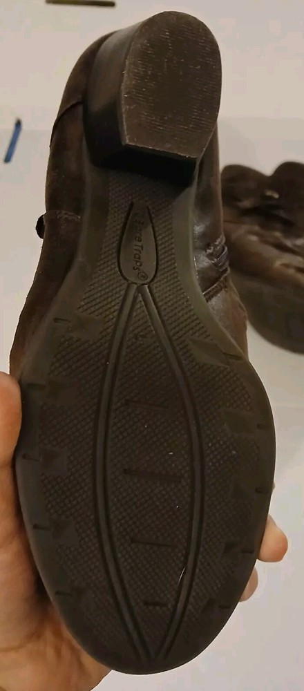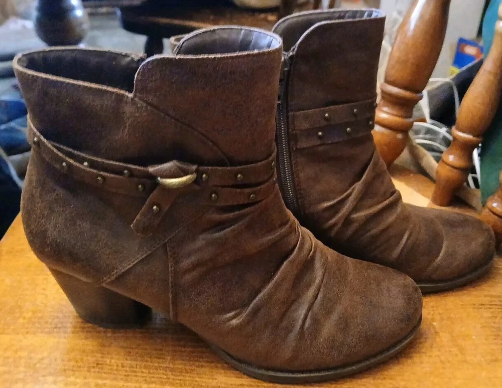 Step out in style and comfort with the Baretraps Rainly ankle booties. These brown booties feature an almond toe shape, a zip closure, and a studded leather band accent for a touch of edginess. They also feature a knot detail on the side. They are perfect for any occasion, whether it's for travel, casual outings, or business meetings. Signs of wear on upper front and toe area. (See last 2 pictures)