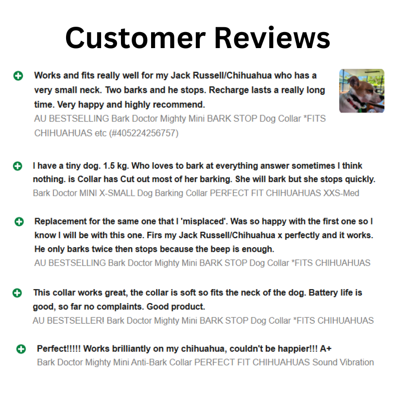 Best-Selling Mini Bark Collar in Australia! Bark Doctor's Mighty Mini Bark Collar is specially designed for teacup and miniature dogs. The contact jaw design contours softly on the neck for a comfortable fit. The sensor hole with adjustable sensitivity detects the dog?s barking and automatically emits a programmed sequence of beep warning and vibrations at increasing intensity. This uses absolutely no shock, just sound and vibration powered by a nifty internal microprocessor contained in the compact and durable case that comes in three cute colours. If you?ve been struggling to find an effective, safe and affordable bark stop collar for your chihuahua, toy poodle, mini foxy or any other extra small breeds, then the Mighty Mini Bark Collar is for you. FEATURES Easy to use and test. The new sensor hole activates the collar by more sensitively capturing throat vibration when dog barks. You can test it yourself by simply blowing air into the sensor hole. Trains dog not punishes. Collar emits a warning sound during the first two barks. When barking continues, it emits a combination of Sound + Vibration from the third to seventh bark. The vibration time increases the more successive times the collar is triggered. Auto protect for enhanced safety. Enters into one-minute auto-protection mode after being triggered seven times continuously. Press + - button to adjust the 7 sensitivity levels. You know it's working when the indicator light is on. Most effective on dogs from 2 to 25kgs. (4.5lbs-50lbs). Enhanced night time safety with a high quality 1.5cm wide Black Polyester Belt with 2 reflective strips Sizing of Mighty Mini Designed to work best for dogs from 2 to 12kgs. Belt is adjustable 15cm to 50cm around the neck. Collar receiver is 4cm across, 3cm tall and 2cm thick. Weight of collar receiver and belt: 29g Accessories: 1 x Collar 1 x Belt 1 x DC USB Charging Cable 1 x English Manual